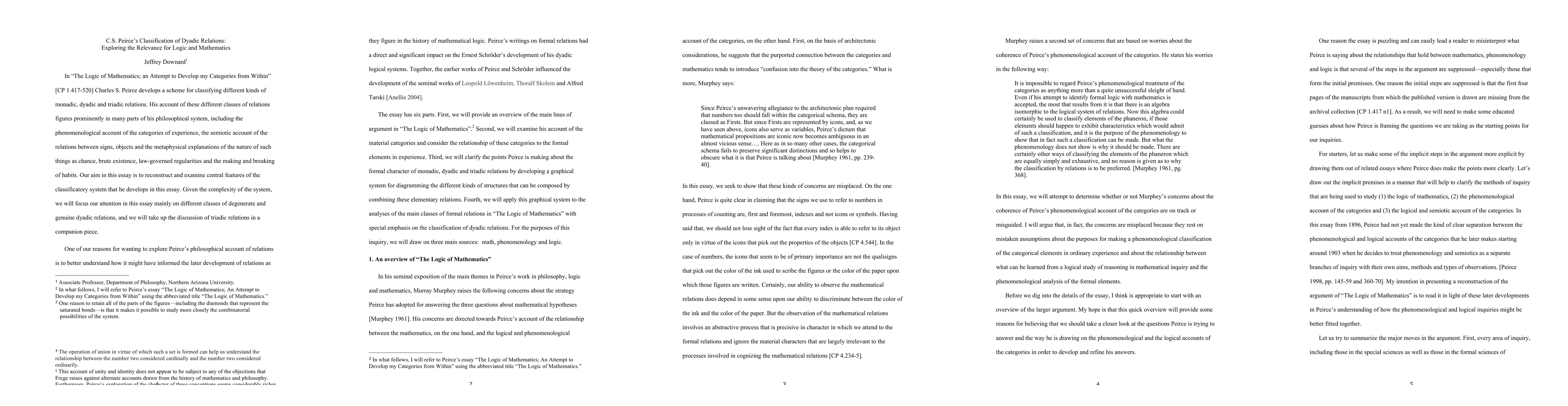 Charles Peirce develops a scheme for classifying different kinds of monadic, dyadic and triadic relations. His account of these different classes of relations figures prominently in the development of his algebraic and diagrammatic systems of mathematical logic. Our aim in this essay is to reconstruct and examine central features of the classificatory system that he develops. Given the complexity of the system, we will focus our attention on the classification and explanation of of degenerate and genuine dyadic relations, and we will take up the discussion of triadic relations elsewhere. One of our reasons for wanting to explore this account of relations is to better understand how it informed the later development of relations as they figure in the history of mathematical logic. The earlier work of Peirce on dyadic relations influenced the development of the account of dyadic logical relations in works of Ernst Schroder, Leopold Lowenheim, Thoralf Skolem and Alfred Tarski. As such, our primary aim in this essay is to trace the early development of these ideas about the formal relation of the dyad for the sake of better understanding how it might have influenced these later developments.