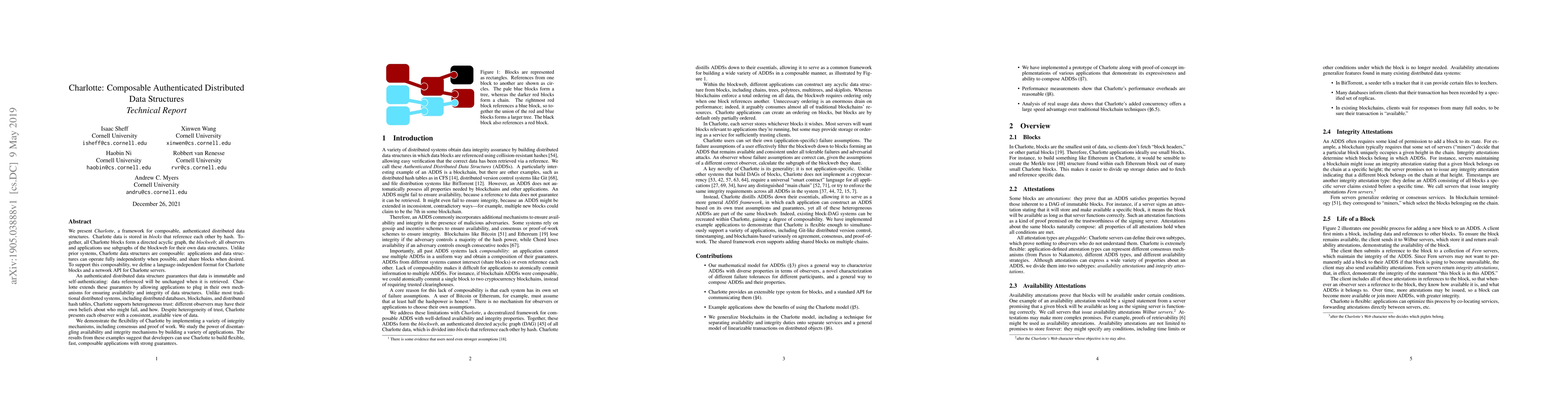 Charlotte is a framework for composable, authenticated distributed data structures that uses a blockweb to store data in a directed acyclic graph. It allows applications to independently operate and share blocks, providing heterogeneous trust and consistent data views across different observers.