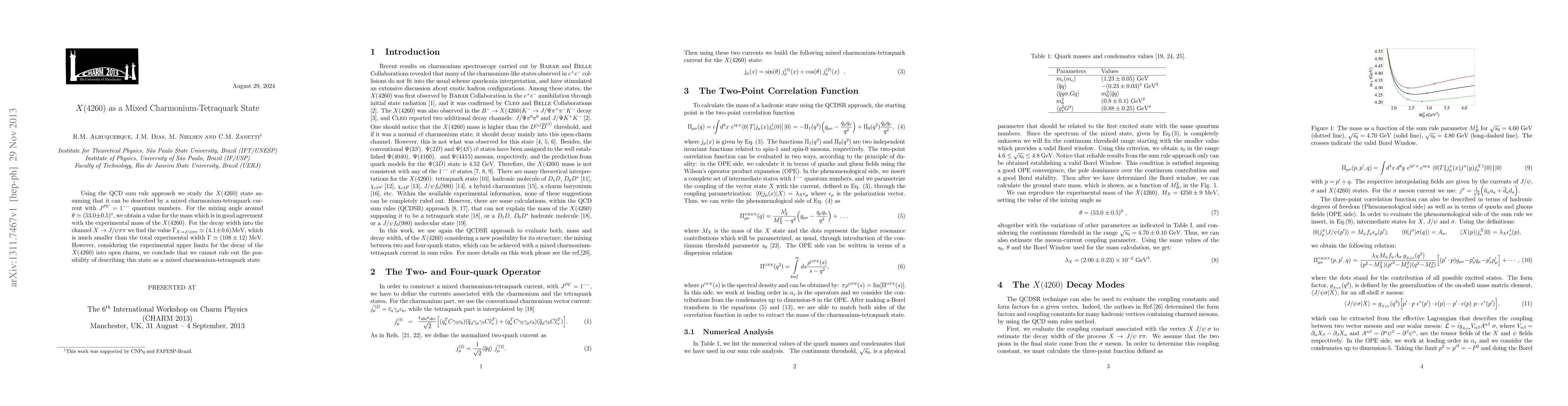The CHARM 2013 study proposes that the X(4260) particle can be modeled as a mixed charmonium-tetraquark state with a mixing angle of $\theta=(53.0 \pm 0.5)^0$, yielding a mass consistent with experimental data. The predicted decay width into $J/\psi \pi \pi$ is significantly smaller than the total experimental width, suggesting further investigation is needed to fully understand its decay properties.