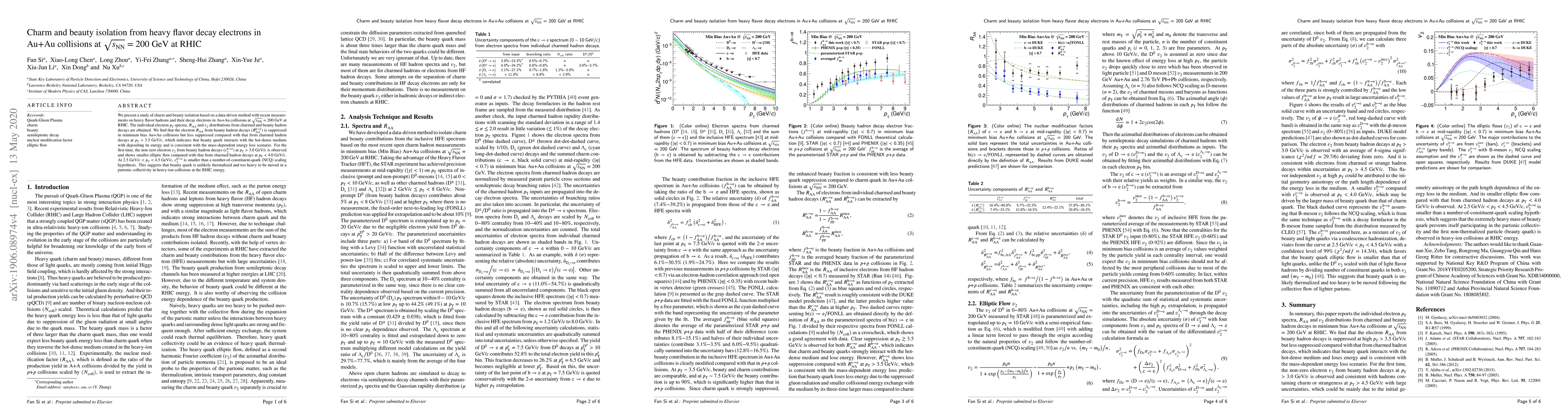 This study isolates charm and beauty quarks from heavy flavor decay electrons in Au+Au collisions at RHIC, finding that beauty quark interactions show less suppression and smaller elliptic flow compared to charm, indicating mass-dependent energy loss and suggesting beauty quarks are too heavy to thermalize in the medium.