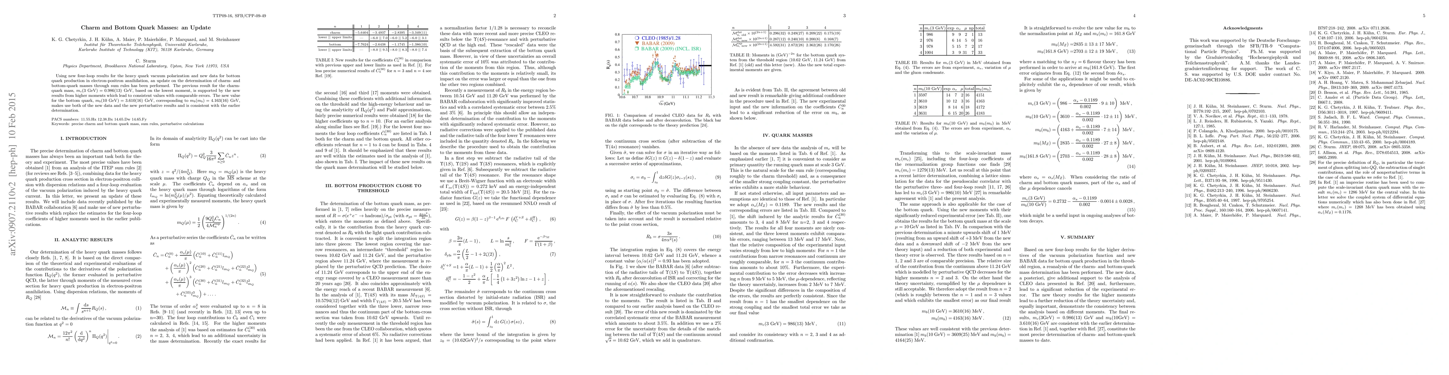 This paper updates the determination of charm and bottom quark masses using new four-loop results and recent data. The new charm quark mass value, $m_c(3 {\rm GeV})= 0.986(13) {\rm GeV}$, is consistent across different moments, while the updated bottom quark mass, $m_b(10 {\rm GeV})= 3.610(16) {\rm GeV}$, aligns with previous findings.