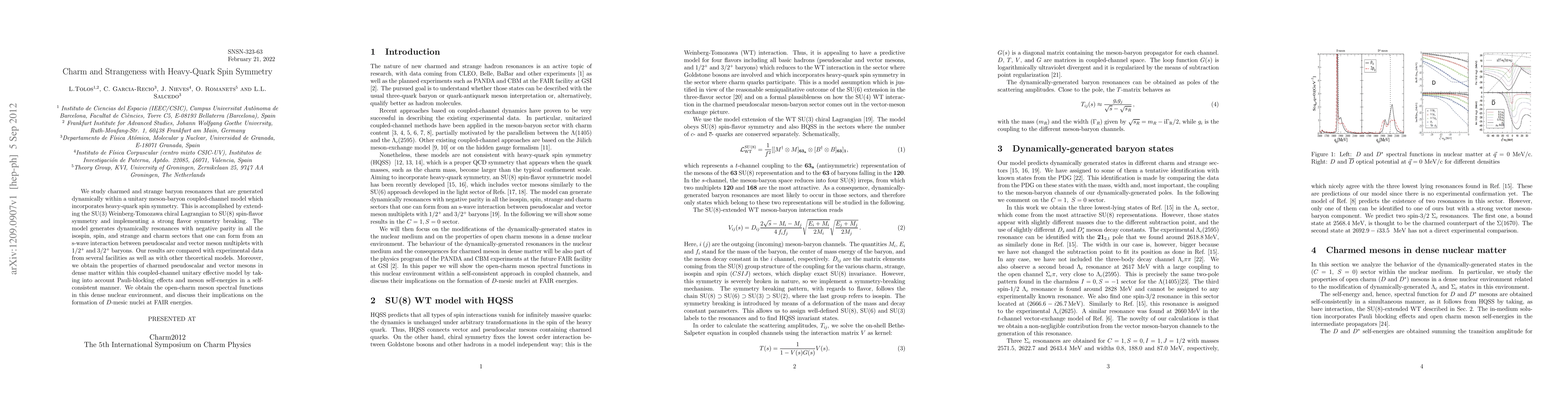 This paper investigates charmed and strange baryon resonances using a coupled-channel model that incorporates heavy-quark spin symmetry, generating dynamically negative-parity resonances from s-wave meson-baryon interactions. The study also explores the properties of open-charm mesons in dense matter and their implications for $D$-mesic nuclei formation.