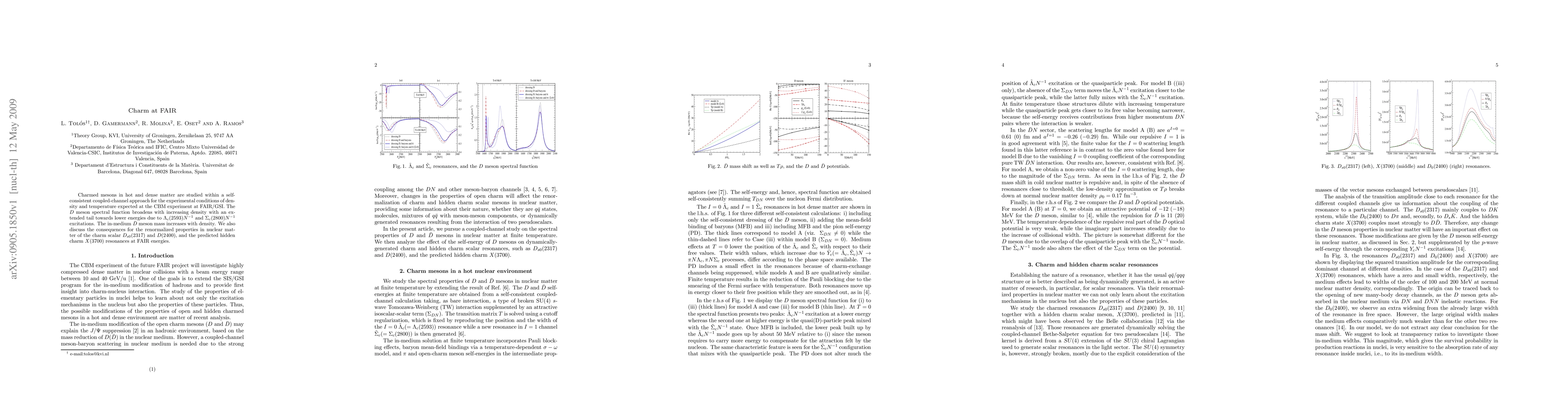 Charmed mesons in hot and dense matter are studied within a self-consistent coupled-channel approach for the experimental conditions of density and temperature expected at the CBM experiment at FAIR/GSI. The $D$ meson spectral function broadens with increasing density with an extended tail towards lower energies due to $\Lambda_c(2593) N^{-1}$ and $\Sigma_c(2800) N^{-1}$ excitations. The in-medium $\bar D$ meson mass increases with density. We also discuss the consequences for the renormalized properties in nuclear matter of the charm scalar $D_{s0}(2317)$ and D(2400), and the predicted hidden charm X(3700) resonances at FAIR energies.