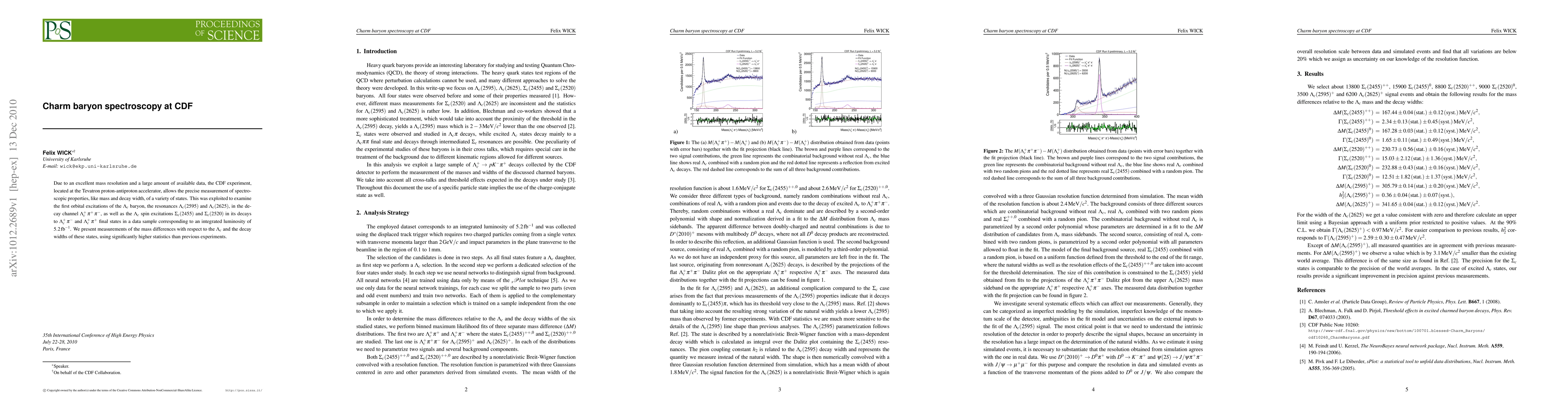 Due to an excellent mass resolution and a large amount of available data, the CDF experiment, located at the Tevatron proton-antiproton accelerator, allows the precise measurement of spectroscopic properties, like mass and decay width, of a variety of states. This was exploited to examine the first orbital excitations of the Lambdac baryon, the resonances Lambdac(2595) and Lambdac(2625), in the decay channel Lambdac+ pi+ pi-, as well as the Lambdac spin excitations Sigmac(2455) and Sigmac(2520) in its decays to Lambdac+ pi- and Lambdac+ pi+ final states in a data sample corresponding to an integrated luminosity of 5.2 invfb. We present measurements of the mass differences with respect to the Lambdac and the decay widths of these states, using significantly higher statistics than previous experiments.