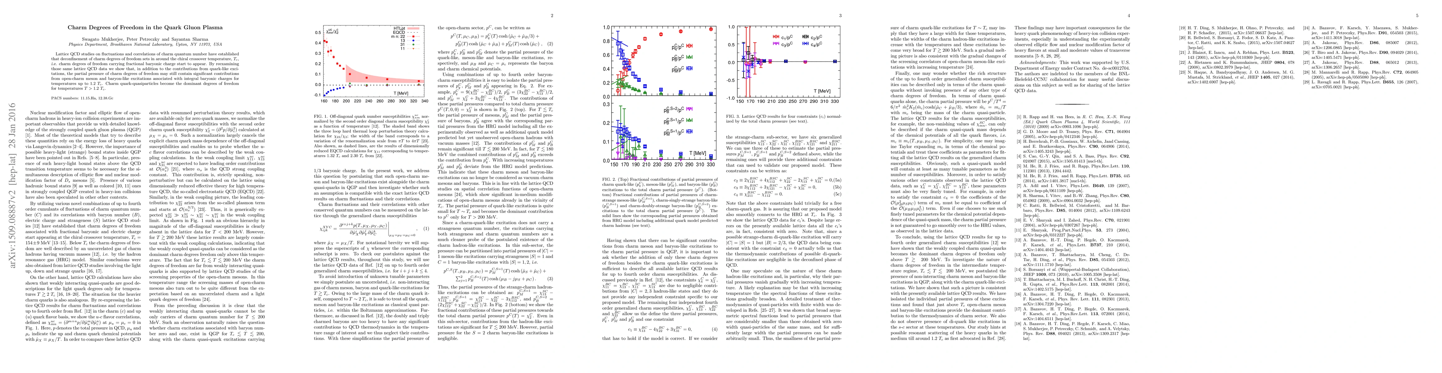 Lattice QCD studies on fluctuations and correlations of charm quantum number have established that deconfinement of charm degrees of freedom sets in around the chiral crossover temperature, $T_c$, i.e. charm degrees of freedom carrying fractional baryonic charge start to appear. By reexamining those same lattice QCD data we show that, in addition to the contributions from quark-like excitations, the partial pressure of charm degrees of freedom may still contain significant contributions from open-charm meson and baryon-like excitations associated with integral baryonic charges for temperatures up to $1.2~ T_c$. Charm quark-quasiparticles become the dominant degrees of freedom for temperatures $T>1.2~ T_c$.