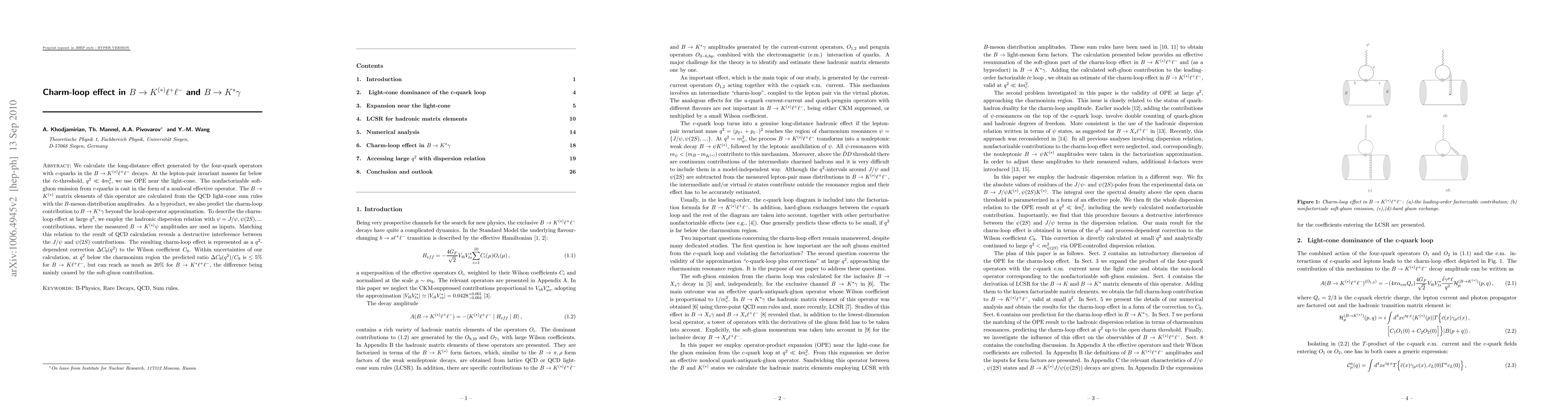 We calculate the long-distance effect generated by the four-quark operators with $c$-quarks in the $B\to K^{(*)} \ell^+\ell^-$ decays. At the lepton-pair invariant masses far below the $\bar{c}c$-threshold, $q^2\ll 4m_c^2$, we use OPE near the light-cone. The nonfactorizable soft-gluon emission from $c$-quarks is cast in the form of a nonlocal effective operator. The $B\to K^{(*)}$ matrix elements of this operator are calculated from the QCD light-cone sum rules with the $B$-meson distribution amplitudes. As a byproduct, we also predict the charm-loop contribution to $B\to K^*\gamma$ beyond the local-operator approximation. To describe the charm-loop effect at large $q^2$, we employ the hadronic dispersion relation with $\psi=J/\psi,\psi (2S), ...$ contributions, where the measured $ B\to K^{(*)}\psi $ amplitudes are used as inputs. Matching this relation to the result of QCD calculation reveals a destructive interference between the $J/\psi$ and $\psi(2S)$ contributions. The resulting charm-loop effect is represented as a $q^2$-dependent correction $\Delta C_9(q^2)$ to the Wilson coefficient $C_9$. Within uncertainties of our calculation, at $q^2$ below the charmonium region the predicted ratio $\Delta C_9(q^2)/C_9$ is $\leq 5% $ for $B\to K \ell^+\ell^-$, but can reach as much as 20% for $B\to K^*\ell^+\ell^-$, the difference being mainly caused by the soft-gluon contribution.