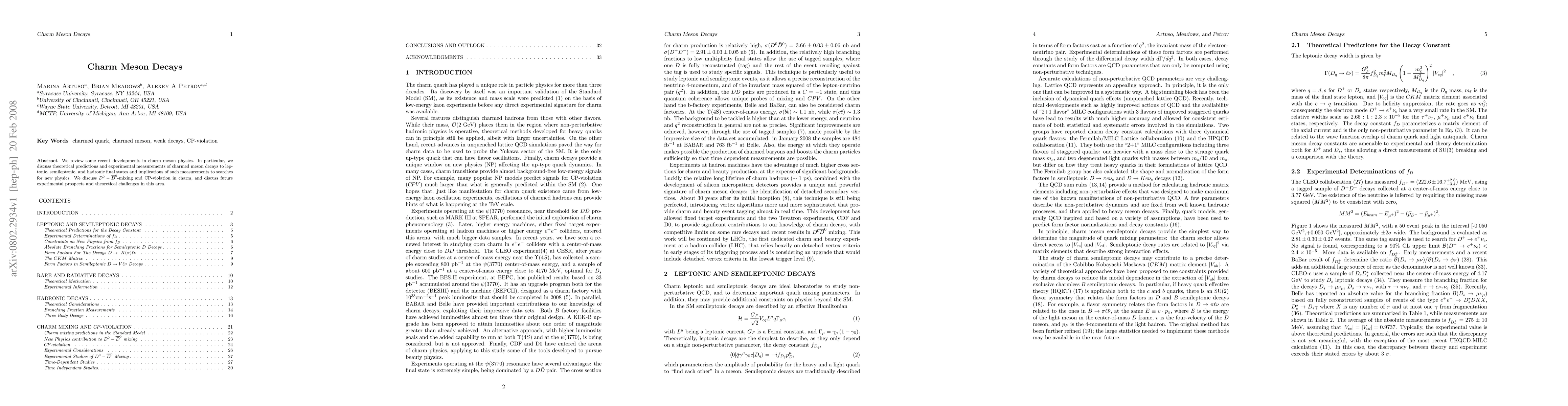 This paper reviews recent advancements in charm meson physics, focusing on theoretical predictions and experimental measurements of decays into various final states, including leptonic, semileptonic, and hadronic. It also discusses D0-anti-D0-mixing, CP-violation, and future experimental prospects, highlighting implications for new physics searches.