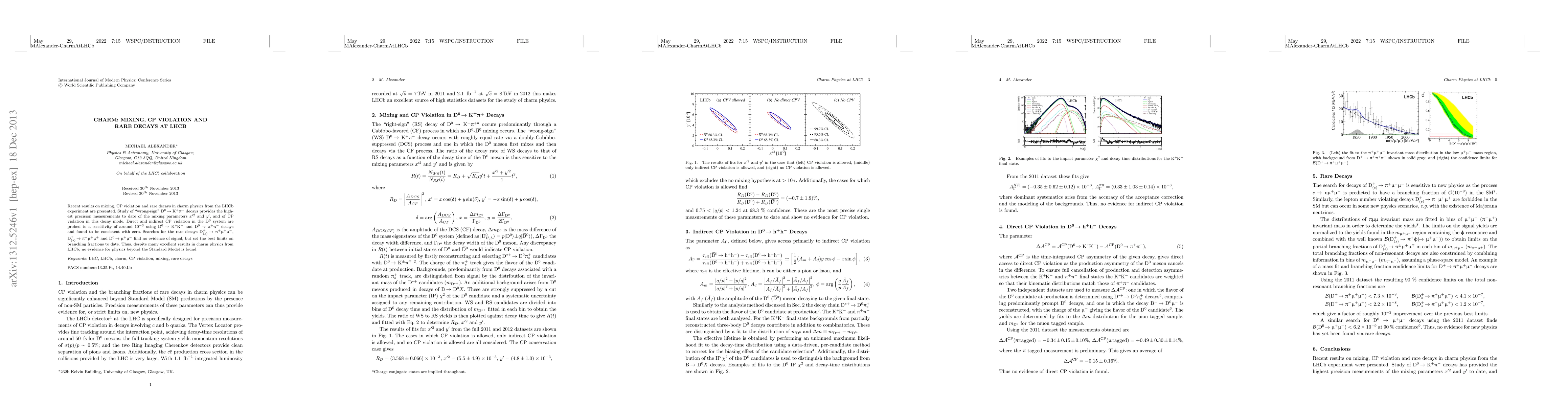 Recent results on mixing, CP violation and rare decays in charm physics from the LHCb experiment are presented. Study of ''wrong-sign'' $D^{0} \rightarrow K^+ \pi^-$ decays provides the highest precision measurements to date of the mixing parameters $x^{\prime 2}$ and $y^{\prime}$, and of CP violation in this decay mode. Direct and indirect CP violation in the $D^0$ system are probed to a sensitivity of around $10^{-3}$ using $D^0 \rightarrow K^+K^-$ and $D^0 \rightarrow \pi^+\pi^-$ decays and found to be consistent with zero. Searches for the rare decays $D^+_{(s)} \rightarrow \pi^+\mu^+\mu^-$, $D^+_{(s)} \rightarrow \pi^-\mu^+\mu^+$ and $D^0 \rightarrow \mu^+\mu^-$ find no evidence of signal, but set the best limits on branching fractions to date. Thus, despite many excellent results in charm physics from LHCb, no evidence for physics beyond the Standard Model is found.