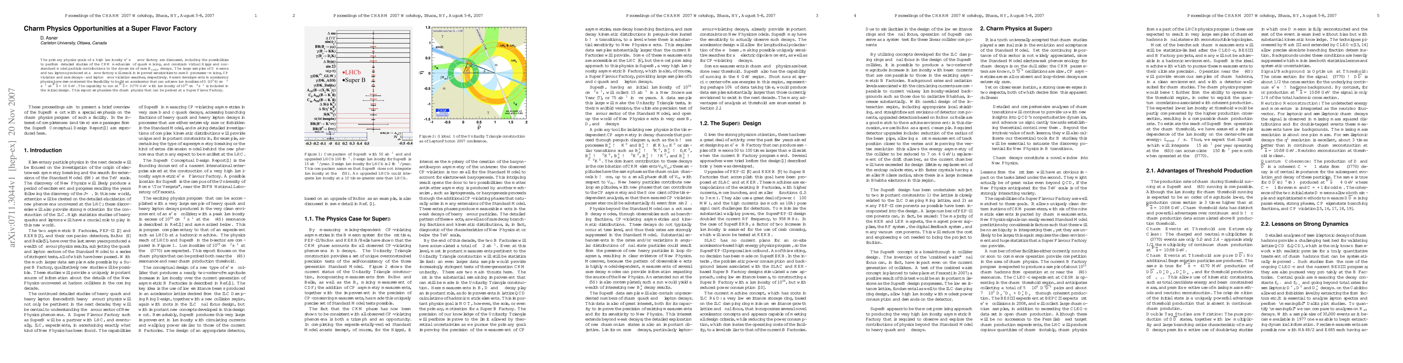 The primary physics goals of a high luminosity e+e- flavor factory are discussed, including the possibilities to perform detailed studies of the CKM mechanism of quark mixing, and constrain virtual Higgs and non-standard model particle contributions to the dynamics of rare B_{u,d,s} decays. The large samples of D mesons and tau leptons produced at a flavor factory will result in improved sensitivities to rare D processes - mixing, CP violation and rare decays - and lepton flavor violation searches, respectively. Recent developments in accelerator physics have demonstrated the feasibility to build an accelerator that can achieve luminosities of ~10^36 cm-2 s^-1 at sqrt{s}=10 GeV. The capablity to run at sqrt{s}=3.770 GeV with luminosity of ~10^35 cm^-2 s^-1 is included in the initial design. This report emphasizes the charm physics that can be probed at a Super Flavor Factory.