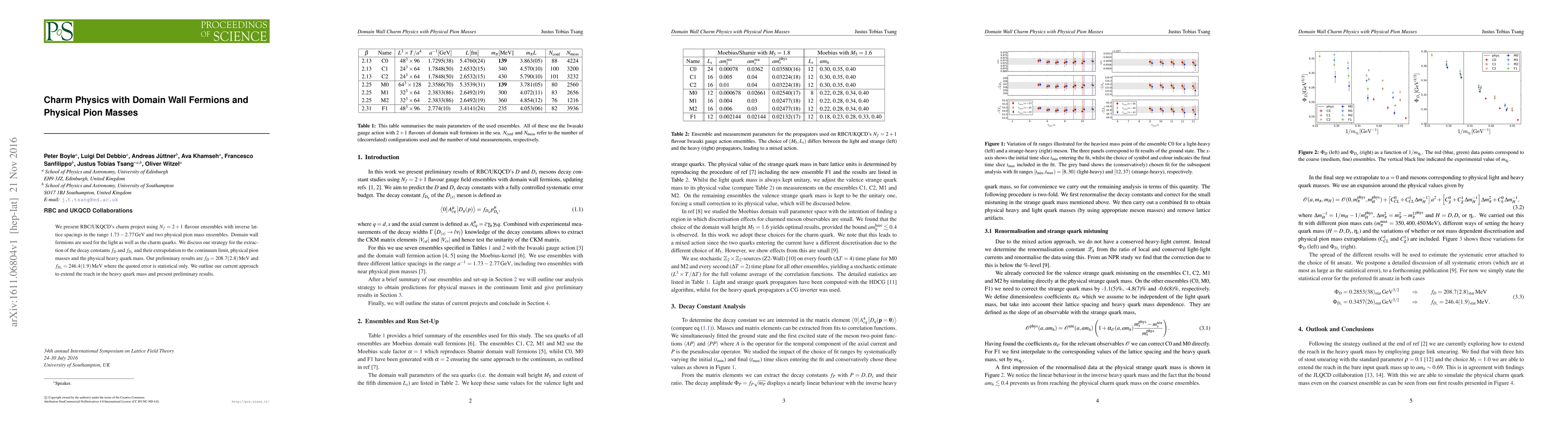 Researchers used domain wall fermions to study charm physics with two physical pion mass ensembles, obtaining preliminary results for decay constants $f_D$ and $f_{D_s}$ of 208.7 MeV and 246.4 MeV, respectively.