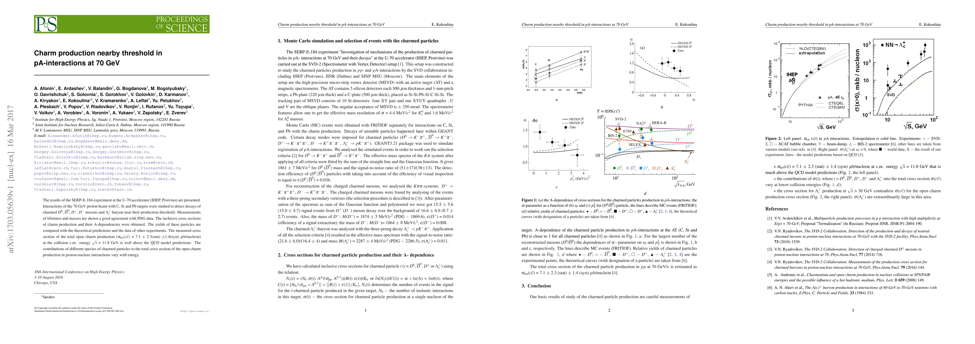 The results of the SERP-E-184 experiment at the U-70 accelerator (IHEP, Protvino) are presented. Interactions of the 70 GeV proton beam with C, Si and Pb targets were studied to detect decays of charmed $D^0$, $\overline D^0$, $D^+$, $D^-$ mesons and $\Lambda _c^+$ baryon near their production threshold. Measurements of lifetimes and masses are shown a good agreement with PDG data. The inclusive cross sections of charm production and their A-dependencies were obtained. The yields of these particles are compared with the theoretical predictions and the data of other experiments. The measured cross section of the total open charm production ($\sigma _{\mathrm {tot}}(c\overline c)$ = 7.1 $\pm $ 2.3(stat) $\pm $1.4(syst) $\mu $b/nucleon) at the collision c.m. energy $\sqrt {s}$ = 11.8 GeV is well above the QCD model predictions. The contributions of different species of charmed particles to the total cross section of the open charm production in proton-nucleus interactions vary with energy.