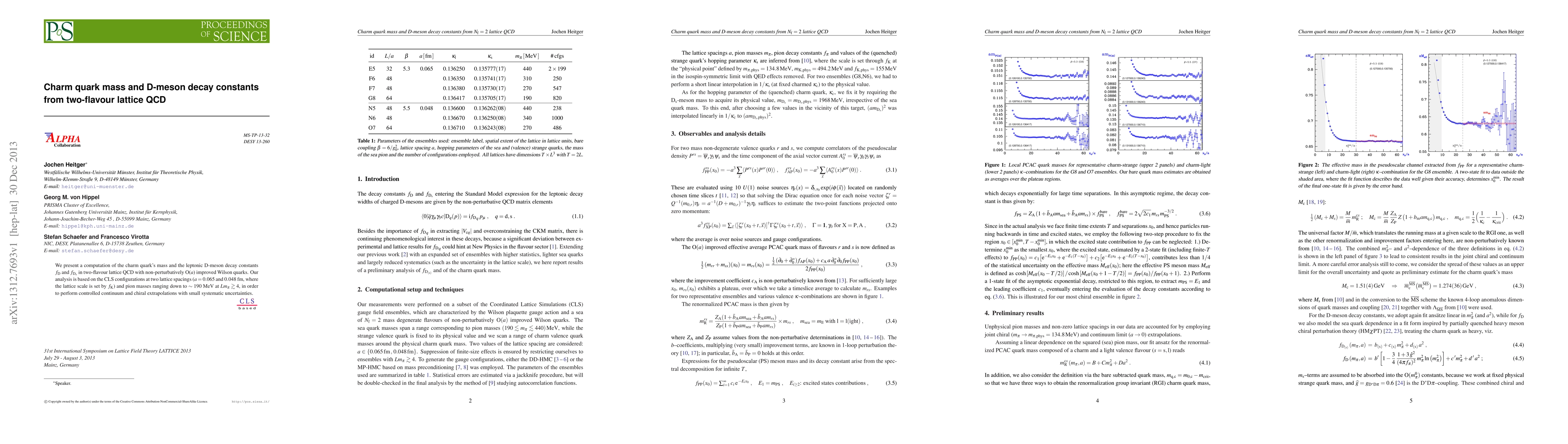 This research computes the charm quark mass and D-meson decay constants f_D and f_{D_s} using two-flavour lattice QCD with improved Wilson quarks, employing CLS configurations at two lattice spacings and pion masses down to ~190 MeV to achieve precise continuum and chiral extrapolations.