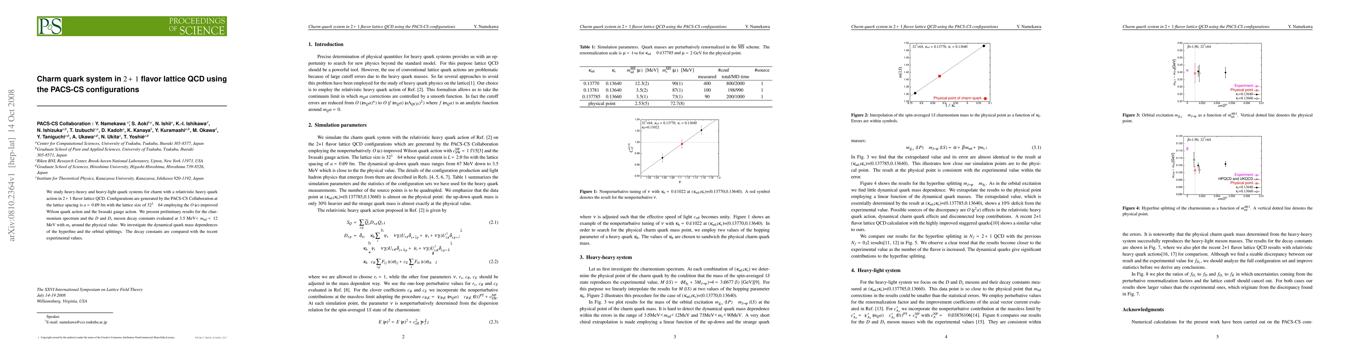 This study explores charm quark systems in 2+1 flavor lattice QCD using PACS-CS configurations, focusing on charmonium spectrum and $D$ and $D_s$ meson decay constants. Preliminary results show dependence on dynamical quark masses and comparisons with experimental decay constants.