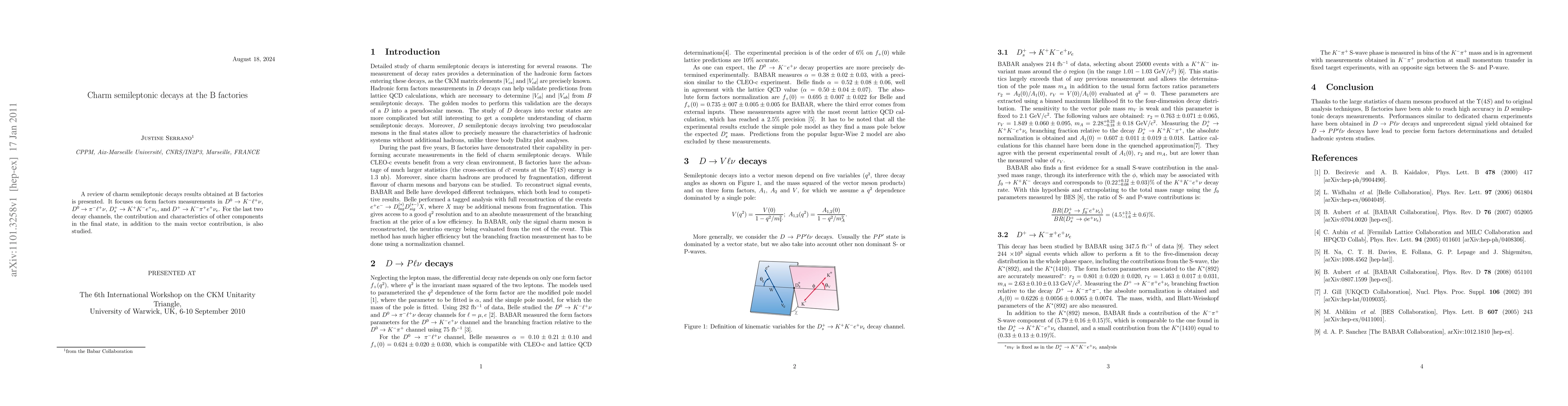 Summary: This paper reviews charm semileptonic decay measurements from B factories, focusing on form factors in $D^0$ to $K^- \ell^+ \nu$, $D^0$ to $\pi^- \ell^+ \nu$, $D_s^+$ to $K^+K^- e^+\nu_e$, and $D^+$ to $K^- \pi^+ e^+\nu_e$ decays, with additional analysis of secondary components in the latter two channels.
