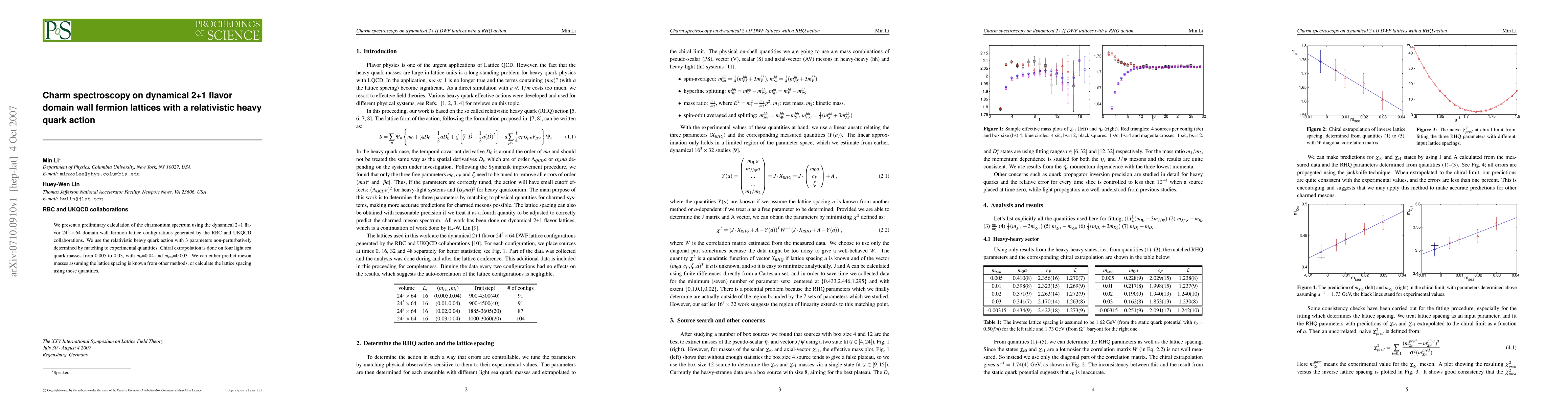 This paper reports a preliminary calculation of the charmonium spectrum using dynamical 2+1 flavor domain wall fermion lattices, employing a relativistic heavy quark action. The study extrapolates chiral symmetry across four light sea quark masses and predicts meson masses or calculates the lattice spacing based on experimental data.