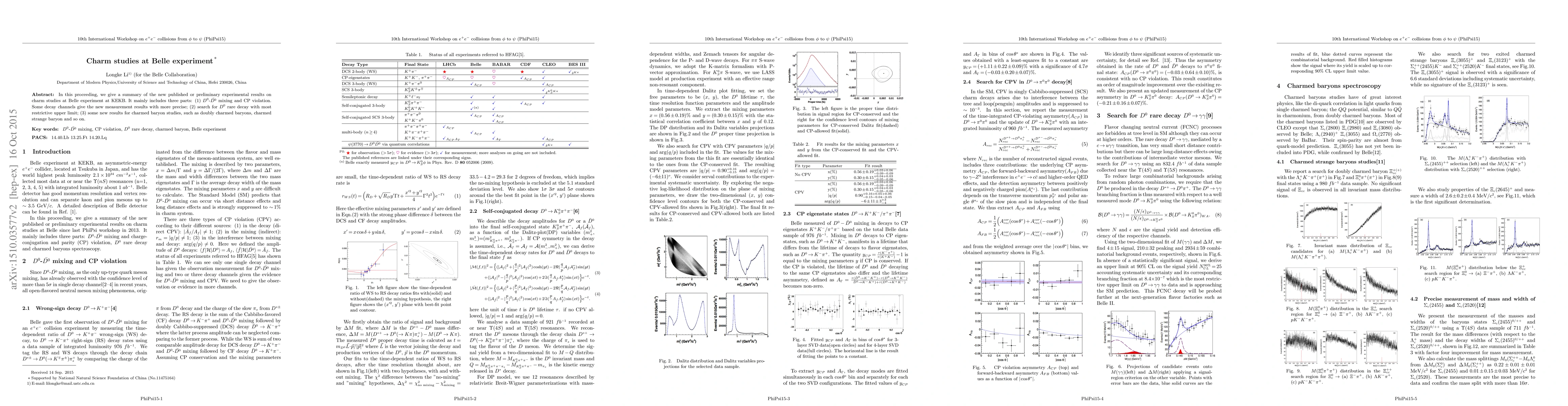 In this proceeding, we give a summary of the new published or preliminary experimental results on charm studies at Belle experiment at KEKB. It mainly includes three parts: (1) $D^0-\bar{D}^0$ mixing and CP violation. Some decay channels give the new measurement results with more precise; (2) search for $D^0$ rare decay with most restrictive upper limit; (3) some new results for charmed baryon studies, such as doubly charmed baryons, charmed strange baryon and so on.