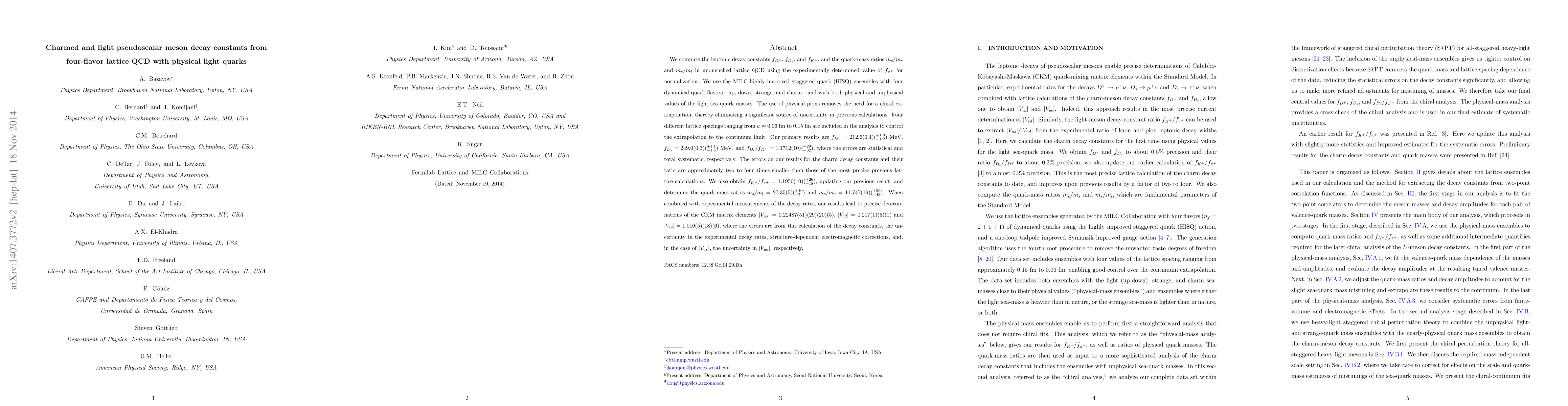 We compute the leptonic decay constants $f_{D^+}$, $f_{D_s}$, and $f_{K^+}$, and the quark-mass ratios $m_c/m_s$ and $m_s/m_l$ in unquenched lattice QCD using the experimentally determined value of $f_{\pi^+}$ for normalization. We use the MILC highly improved staggered quark (HISQ) ensembles with four dynamical quark flavors---up, down, strange, and charm---and with both physical and unphysical values of the light sea-quark masses. The use of physical pions removes the need for a chiral extrapolation, thereby eliminating a significant source of uncertainty in previous calculations. Four different lattice spacings ranging from $a\approx 0.06$ fm to $0.15$ fm are included in the analysis to control the extrapolation to the continuum limit. Our primary results are $f_{D^+} = 212.6(0.4)({}^{+1.0}_{-1.2})\ \mathrm{MeV}$, $f_{D_s} = 249.0(0.3)({}^{+1.1}_{-1.5})\ \mathrm{MeV}$, and $f_{D_s}/f_{D^+} = 1.1712(10)({}^{+29}_{-32})$, where the errors are statistical and total systematic, respectively. The errors on our results for the charm decay constants and their ratio are approximately two to four times smaller than those of the most precise previous lattice calculations. We also obtain $f_{K^+}/f_{\pi^+} = 1.1956(10)({}^{+26}_{-18})$, updating our previous result, and determine the quark-mass ratios $m_s/m_l = 27.35(5)({}^{+10}_{-7})$ and $m_c/m_s = 11.747(19)({}^{+59}_{-43})$. When combined with experimental measurements of the decay rates, our results lead to precise determinations of the CKM matrix elements $|V_{us}| = 0.22487(51) (29)(20)(5)$, $|V_{cd}|=0.217(1) (5)(1)$ and $|V_{cs}|= 1.010(5)(18)(6)$, where the errors are from this calculation of the decay constants, the uncertainty in the experimental decay rates, structure-dependent electromagnetic corrections, and, in the case of $|V_{us}|$, the uncertainty in $|V_{ud}|$, respectively.