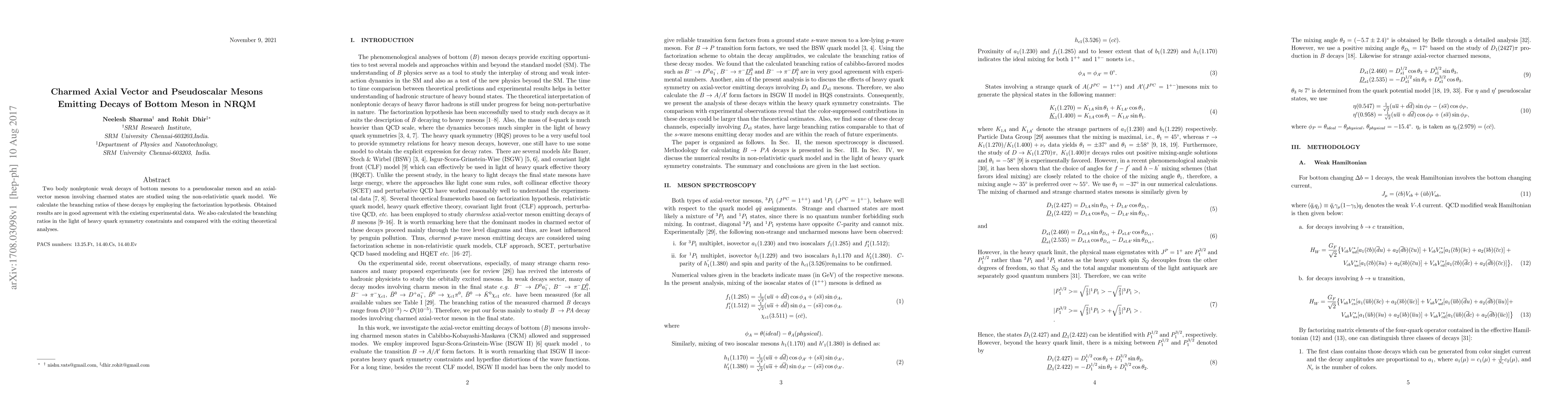 This paper studies two-body nonleptonic weak decays of bottom mesons to charmed axial-vector and pseudoscalar mesons using the non-relativistic quark model, finding results consistent with experimental data and theoretical analyses under heavy quark symmetry constraints.