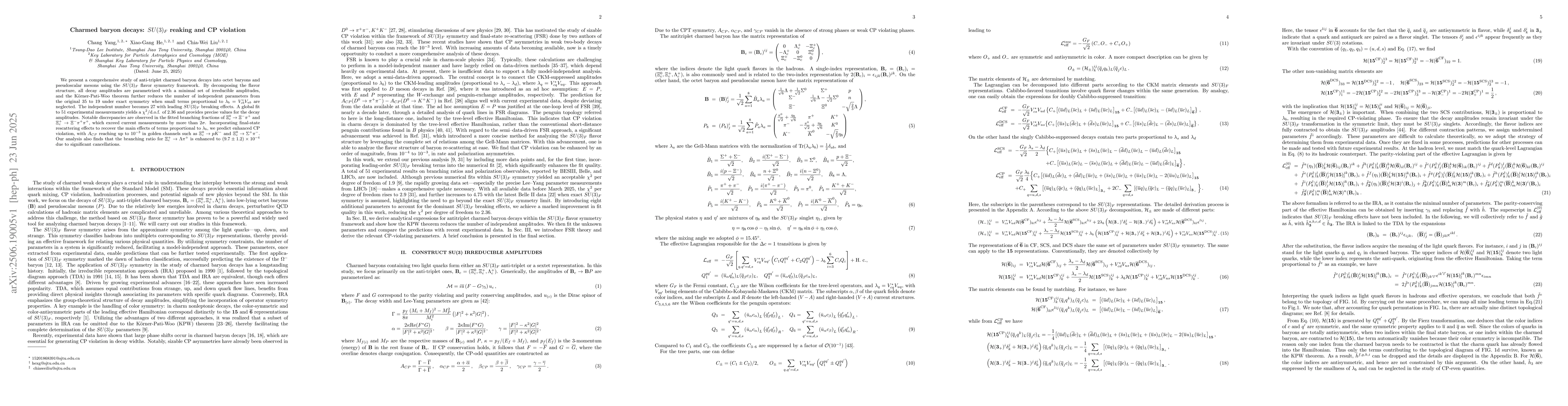 We present a comprehensive study of anti-triplet charmed baryon decays into octet baryons and pseudoscalar mesons using the $SU(3)_F$ flavor symmetry framework. By decomposing the flavor structure, all decay amplitudes are parametrized with a minimal set of irreducible amplitudes, and the K\"{o}rner-Pati-Woo theorem further reduces the number of independent parameters from the original 35 to 19 under exact symmetry when small terms proportional to $\lambda_b = V_{cb}^*V_{ub}$ are neglected. The independent number becomes 27 with leading $SU(3)_F$ breaking effects. A global fit to 51 experimental measurements yields a $\chi^2$/d.o.f. of 2.36 and provides precise values for the decay amplitudes. Notable discrepancies are observed in the fitted branching fractions of $\Xi_c^0 \to \Xi^- \pi^+$ and $\Xi_c^+ \to \Xi^- \pi^+ \pi^+$, which exceed current measurements by more than $2\sigma$. Incorporating final-state rescattering effects to recover the main effects of terms proportional to $\lambda_b$, we predict enhanced CP violation, with $A_{CP}$ reaching up to $10^{-3}$ in golden channels such as $\Xi_c^0 \to p K^-$ and $\Xi_c^0 \to \Sigma^+ \pi^-$. Our analysis also finds that the branching ratio for $\Xi_c^+ \to \Lambda \pi^+$ is enhanced to $(9.7 \pm 1.2) \times 10^{-4}$ due to significant cancellations.