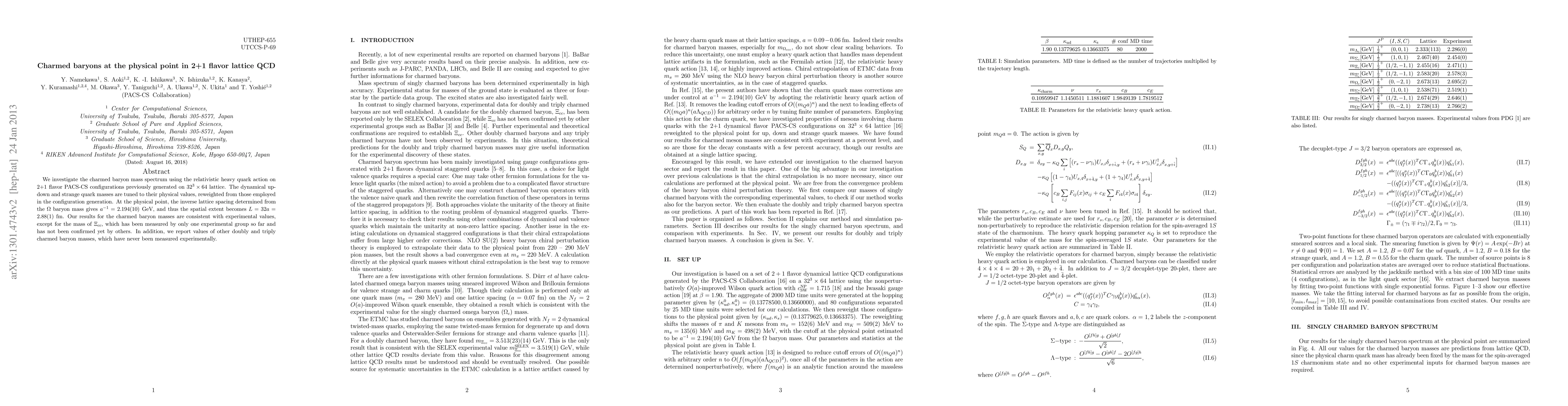 We investigate the charmed baryon mass spectrum using the relativistic heavy quark action on 2+1 flavor PACS-CS configurations previously generated on $32^3 \times 64$ lattice. The dynamical up-down and strange quark masses are tuned to their physical values, reweighted from those employed in the configuration generation. At the physical point, the inverse lattice spacing determined from the $\Omega$ baryon mass gives $a^{-1}=2.194(10)$ GeV, and thus the spatial extent becomes $L = 32 a = 2.88(1)$ fm. Our results for the charmed baryon masses are consistent with experimental values, except for the mass of $\Xi_{cc}$, which has been measured by only one experimental group so far and has not been confirmed yet by others. In addition, we report values of other doubly and triply charmed baryon masses, which have never been measured experimentally.