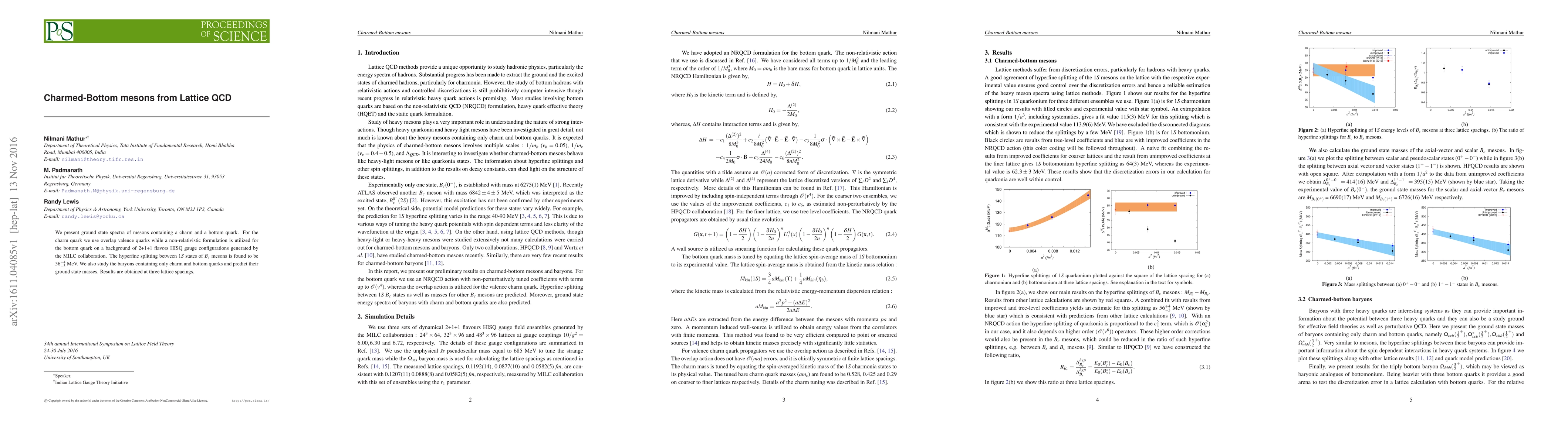 We present ground state spectra of mesons containing a charm and a bottom quark. For the charm quark we use overlap valence quarks while a non-relativistic formulation is utilized for the bottom quark on a background of 2+1+1 flavors HISQ gauge configurations generated by the MILC collaboration. The hyperfine splitting between $1S$ states of $B_c$ mesons is found to be $56^{+4}_{-3}$ MeV. We also study the baryons containing only charm and bottom quarks and predict their ground state masses. Results are obtained at three lattice spacings.