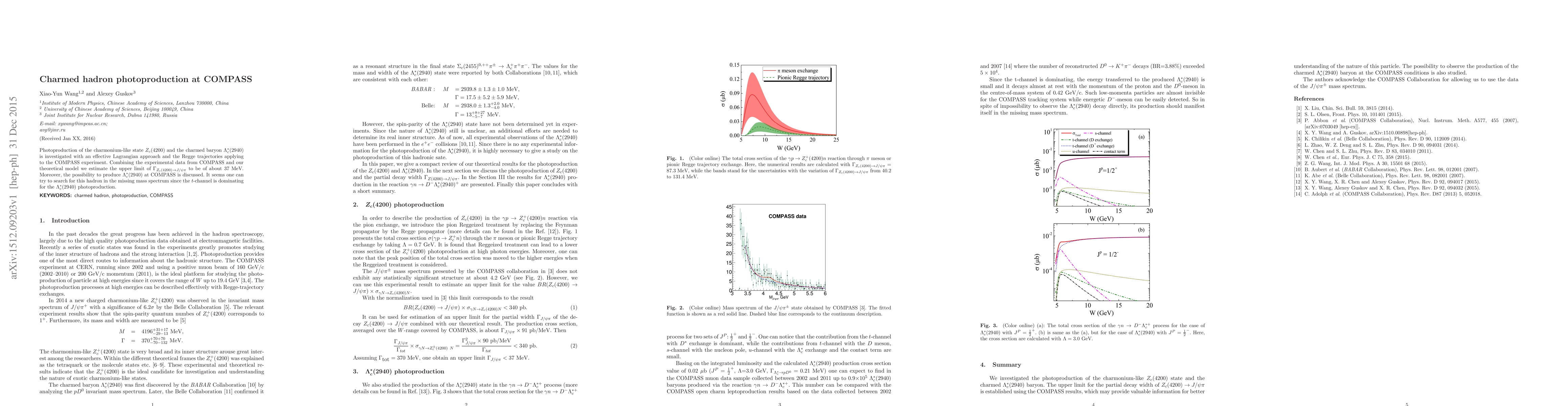 Photoproduction of the charmonium-like state $Z_{c}(4200)$ and the charmed baryon $\Lambda_{c}^{\ast }(2940)$ is investigated with an effective Lagrangian approach and the Regge trajectories applying to the COMPASS experiment. Combining the experimental data from COMPASS and our theoretical model we estimate the upper limit of $\Gamma_{Z_{c}(4200)\rightarrow J/\psi \pi }$ to be of about 37 MeV. Moreover, the possibility to produce $\Lambda_{c}^{\ast }(2940)$ at COMPASS is discussed. It seems one can try to search for this hadron in the missing mass spectrum since the $t$-channel is dominating for the $\Lambda_{c}^{\ast }(2940)$ photoproduction.