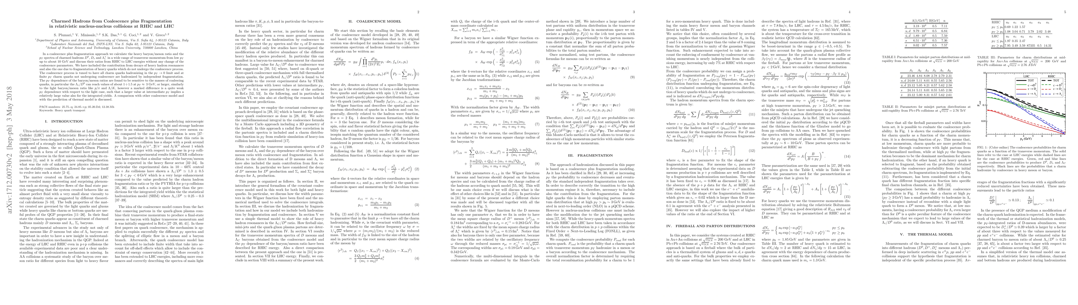 Researchers used a coalescence plus fragmentation approach to study charmed hadrons in relativistic nucleus-nucleus collisions at RHIC and LHC, finding that the baryon/meson ratio varies with transverse momentum and depends on quark masses.