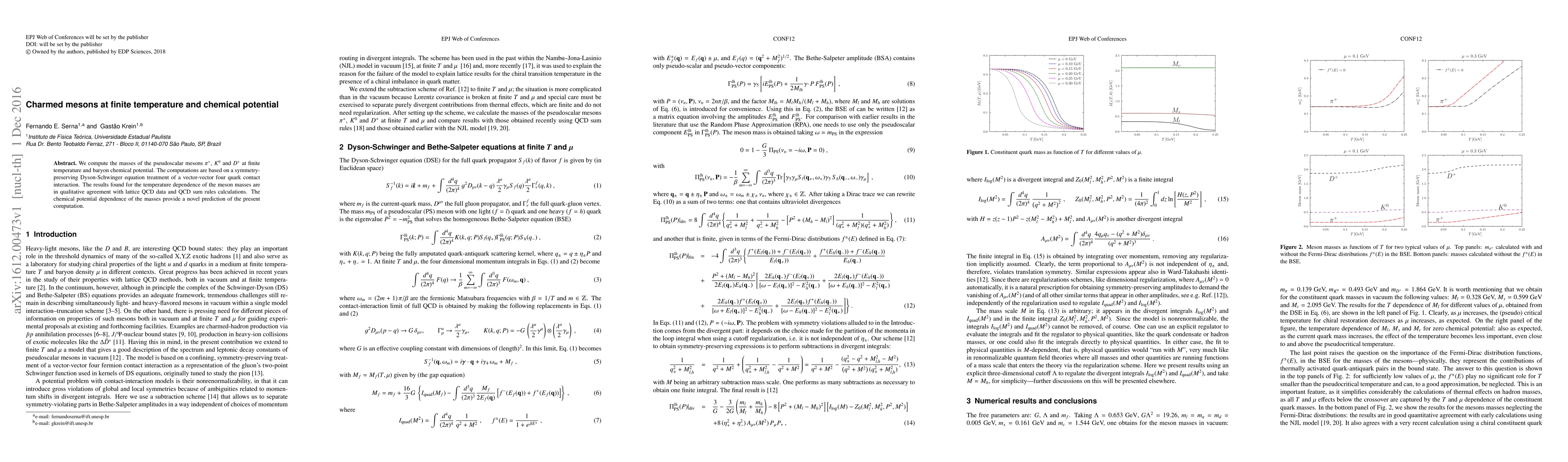 We compute the masses of the pseudoscalar mesons $\pi^+$ , $K^0$ and $D^+$ at finite temperature and baryon chemical potential. The computations are based on a symmetry- preserving Dyson-Schwinger equation treatment of a vector-vector four quark contact interaction. The results found for the temperature dependence of the meson masses are in qualitative agreement with lattice QCD data and QCD sum rules calculations. The chemical potential dependence of the masses provide a novel prediction of the present computation.