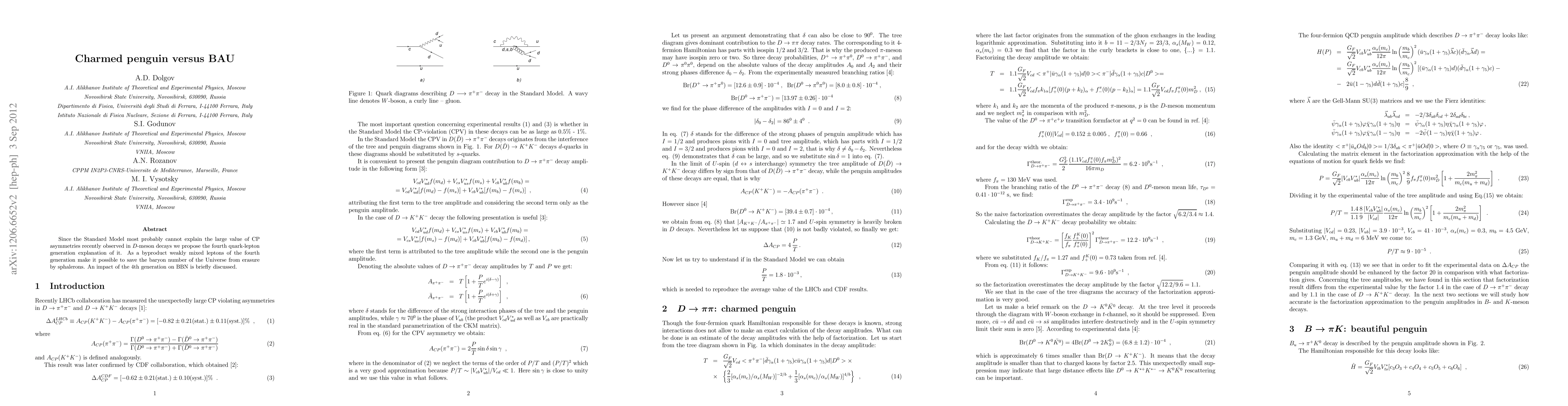 Since the Standard Model most probably cannot explain the large value of CP asymmetries recently observed in D-meson decays we propose the fourth quark-lepton generation explanation of it. As a byproduct weakly mixed leptons of the fourth generation make it possible to save the baryon number of the Universe from erasure by sphalerons. An impact of the 4th generation on BBN is briefly discussed.