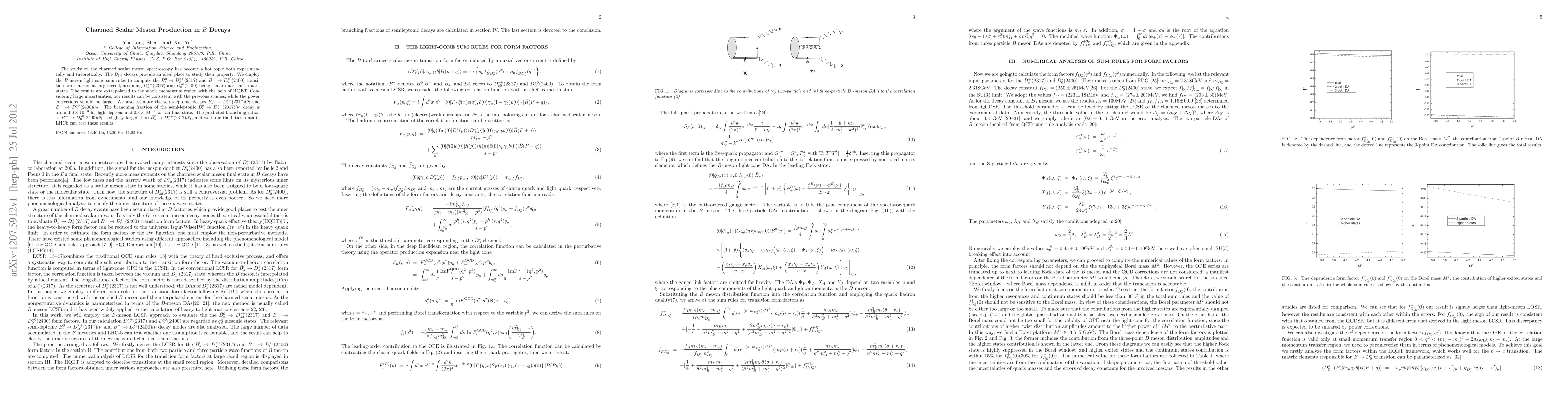 This paper investigates the production of charmed scalar mesons in $B_{(s)}$ decays using $B$-meson light-cone sum rules, finding consistent results with previous studies despite large uncertainties. The study predicts branching fractions for semi-leptonic decays involving these mesons, with hopes that future LHCb data will validate these predictions.
