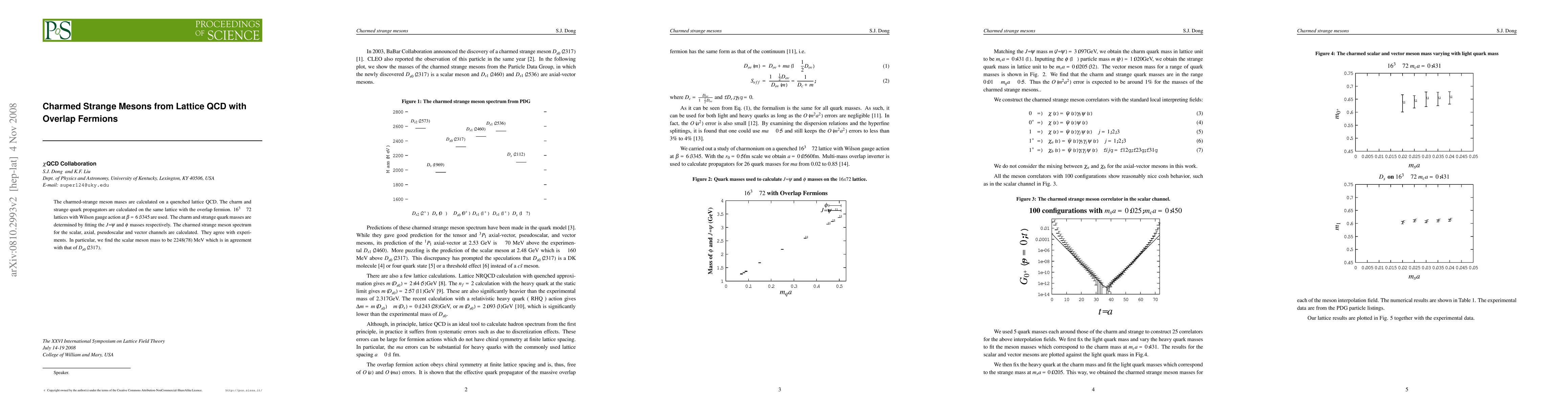 This study calculates charmed-strange meson masses using quenched lattice QCD with overlap fermions on a $16^3\times 72$ lattice. The charm and strange quark masses are fitted to $J/\psi$ and $\phi$ masses, respectively, leading to a good agreement with experimental data, particularly the scalar meson mass of 2248(78) MeV, corresponding to D_{s0}^*(2317).