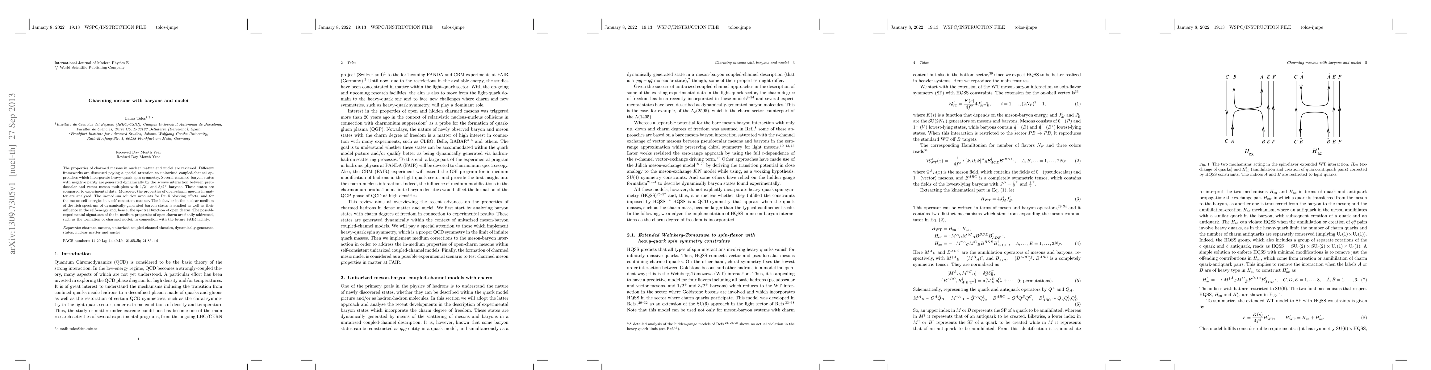 The properties of charmed mesons in nuclear matter and nuclei are reviewed. Different frameworks are discussed paying a special attention to unitarized coupled-channel approaches which incorporate heavy-quark spin symmetry. Several charmed baryon states with negative parity are generated dynamically by the s-wave interaction between pseudoscalar and vector meson multiplets with $1/2^+$ and $3/2^+$ baryons. These states are compared to experimental data. Moreover, the properties of open-charm mesons in matter are analyzed. The in-medium solution accounts for Pauli blocking effects, and for the meson self-energies in a self-consistent manner. The behavior in the nuclear medium of the rich spectrum of dynamically-generated baryon states is studied as well as their influence in the self-energy and, hence, the spectral function of open charm. The possible experimental signatures of the in-medium properties of open charm are finally addressed, such as the formation of charmed nuclei, in connection with the future FAIR facility.