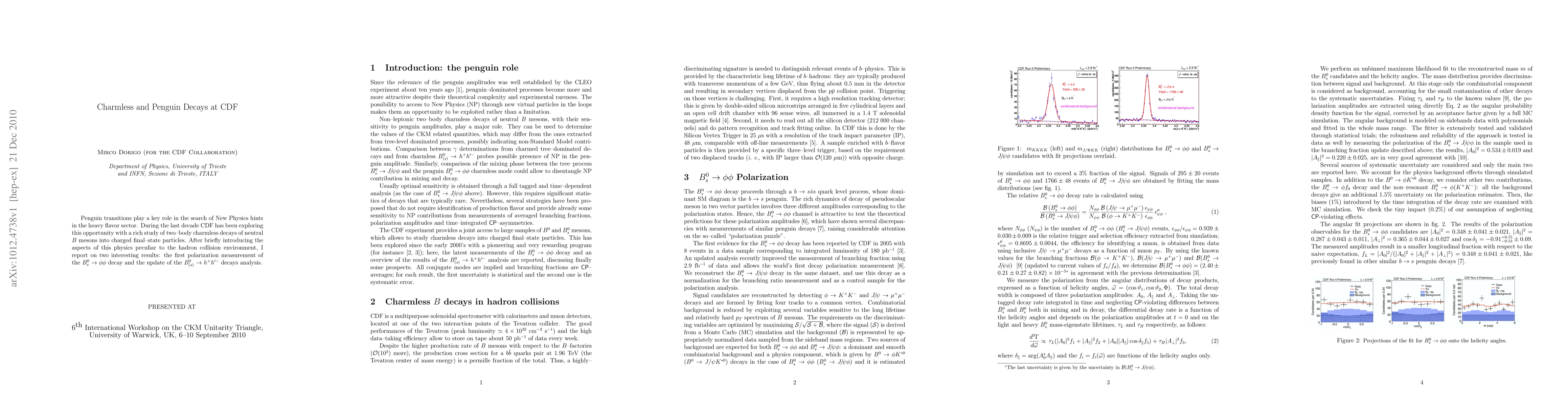 Penguin transitions play a key role in the search of New Physics hints in the heavy flavor sector. During the last decade CDF has been exploring this opportunity with a rich study of two--body charmless decays of neutral B mesons into charged final--state particles. After briefly introducing the aspects of this physics peculiar to the hadron collision environment, I report on two interesting results: the first polarization measurement of the B^0_s --> phi phi decay and the update of the B^0(_s) --> h^+h'^- decays analysis.
