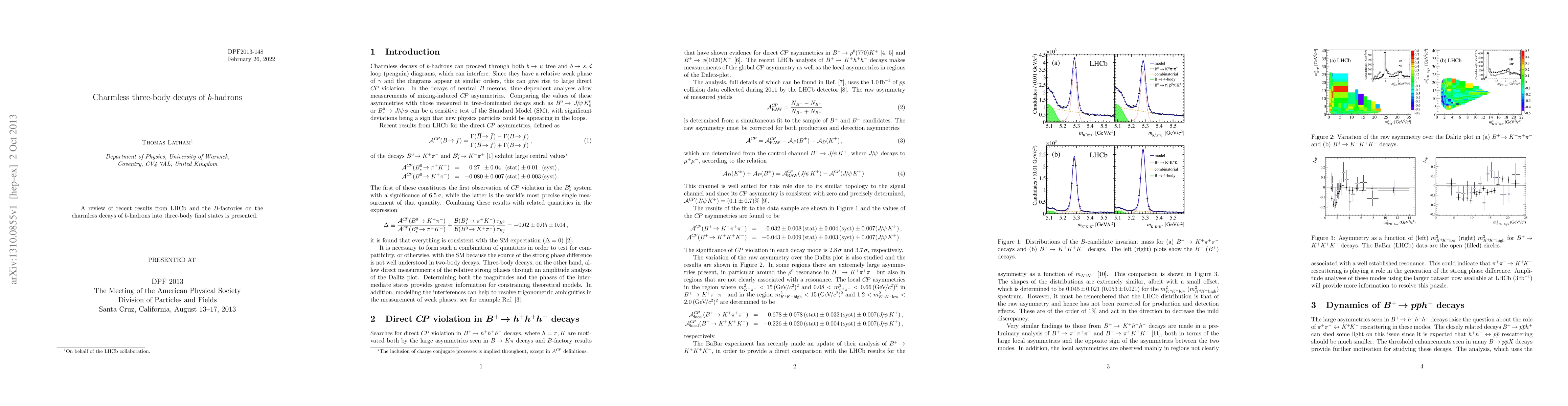 Summary: This paper reviews recent findings from LHCb and B-factories on the charmless three-body decays of b-hadrons, providing insights into their properties and contributing to the understanding of the Standard Model of particle physics.
