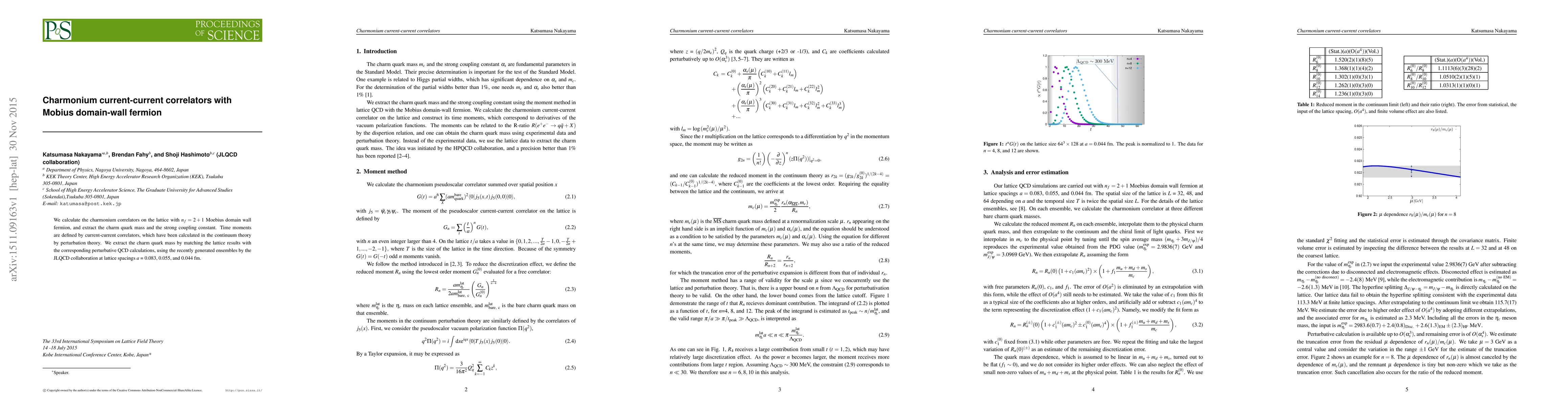 We calculate the charmonium correlators on the lattice with $n_f = 2+ 1$ Moebius domain wall fermion, and extract the charm quark mass and the strong coupling constant. Time moments are defined by current-current correlators, which have been calculated in the continuum theory by perturbation theory. We extract the charm quark mass by matching the lattice results with the corresponding perturbative QCD calculations, using the recently generated ensembles by the JLQCD collaboration at lattice spacings $a = 0.083, 0.055$, and $0.044$ fm.