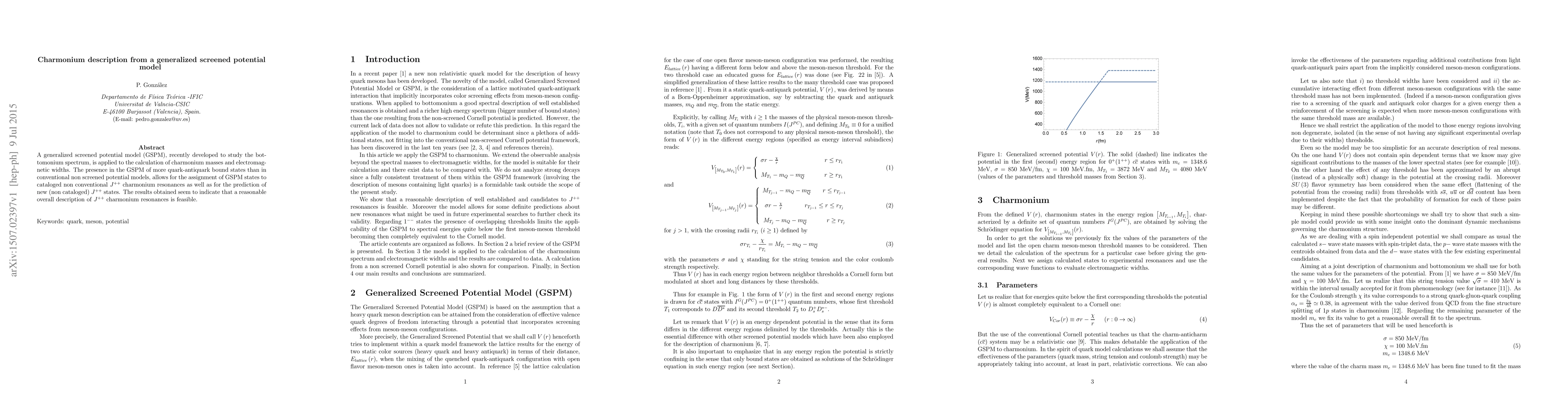 A new approach to studying charmonium, called a generalized screened potential model, successfully describes known $J^{++}$ charmonium resonances and predicts additional states.