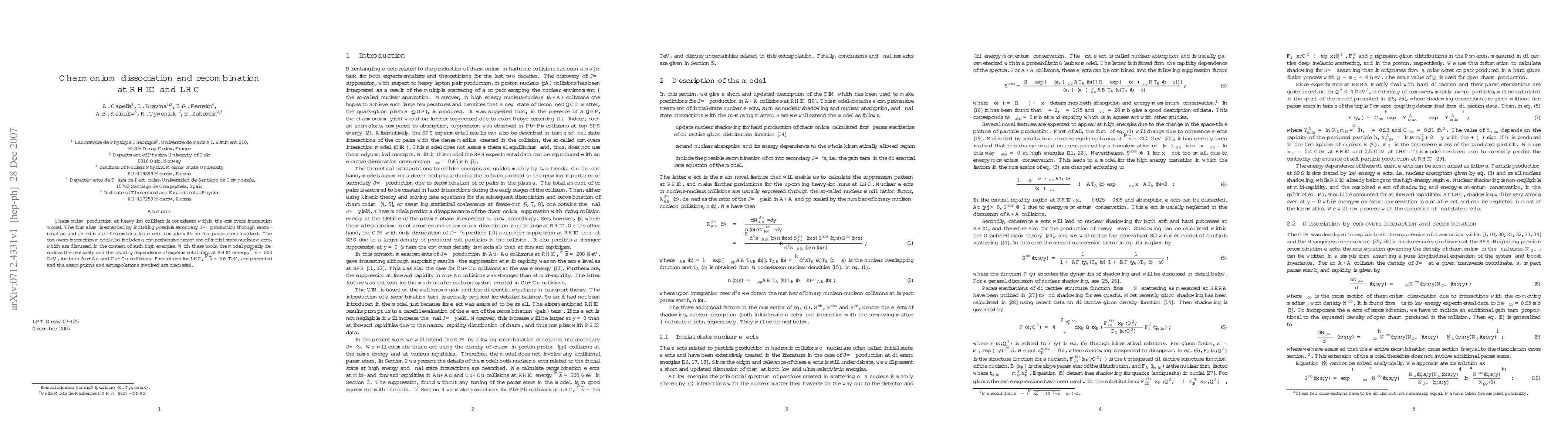 This paper explores charmonium production in heavy-ion collisions using the comovers interaction model, incorporating recombination effects without free parameters. The model successfully explains the centrality and rapidity dependence of experimental data at RHIC and predicts outcomes for LHC energies.