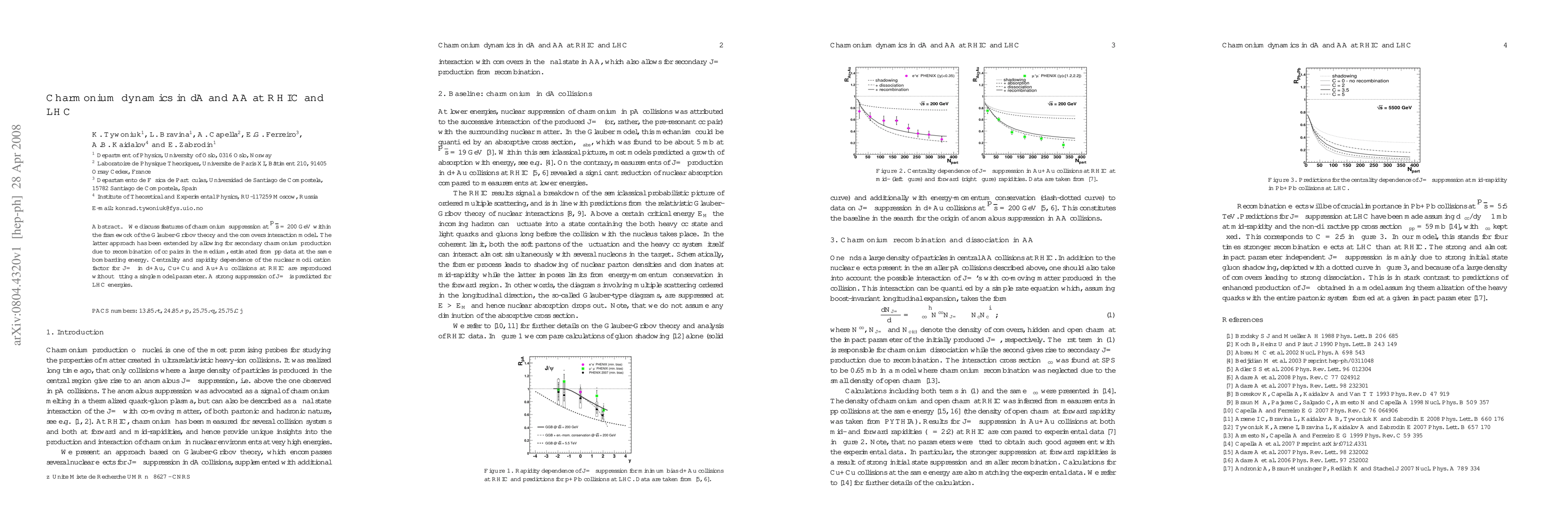 We discuss features of charmonium suppression at $\sqtr{s} = 200$ GeV within the framework of the Glauber-Gribov theory and the comovers interaction model. The latter approach has been extended by allowing for secondary charmonium production due to recombination of $c\bar{c}$ pairs in the medium, estimated from pp data at the same bombarding energy. Centrality and rapidity dependence of the nuclear modification factor for J/psi in d+Au, Cu+Cu and Au+Au collisions at RHIC are reproduced without fitting a single model parameter. A strong suppression of J/psi is predicted for LHC energies.