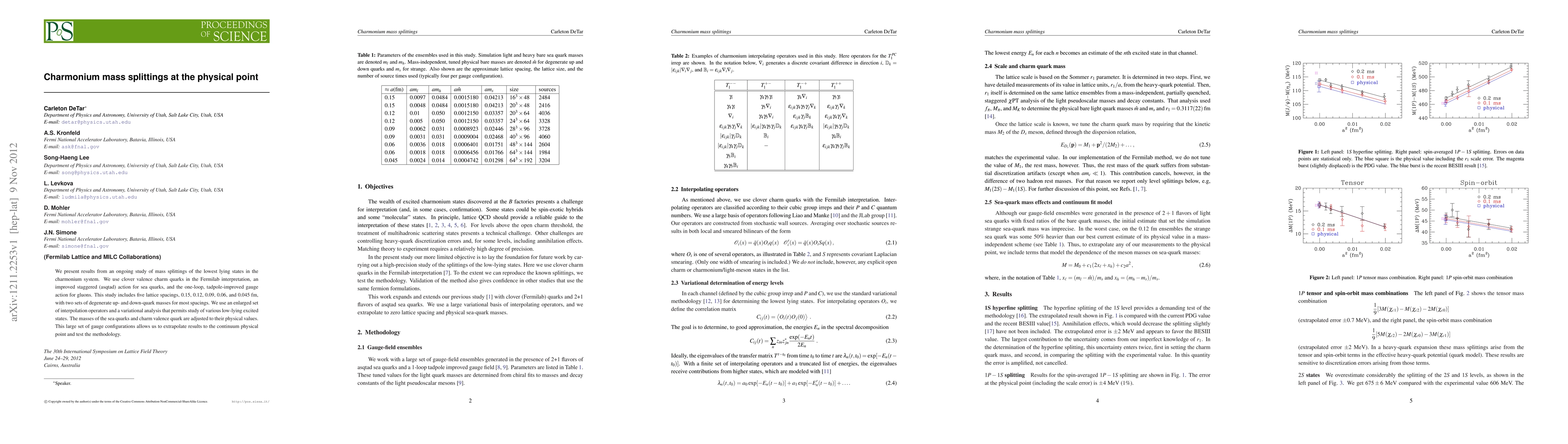 We present results from an ongoing study of mass splittings of the lowest lying states in the charmonium system. We use clover valence charm quarks in the Fermilab interpretation, an improved staggered (asqtad) action for sea quarks, and the one-loop, tadpole-improved gauge action for gluons. This study includes five lattice spacings, 0.15, 0.12, 0.09, 0.06, and 0.045 fm, with two sets of degenerate up- and down-quark masses for most spacings. We use an enlarged set of interpolation operators and a variational analysis that permits study of various low-lying excited states. The masses of the sea quarks and charm valence quark are adjusted to their physical values. This large set of gauge configurations allows us to extrapolate results to the continuum physical point and test the methodology.