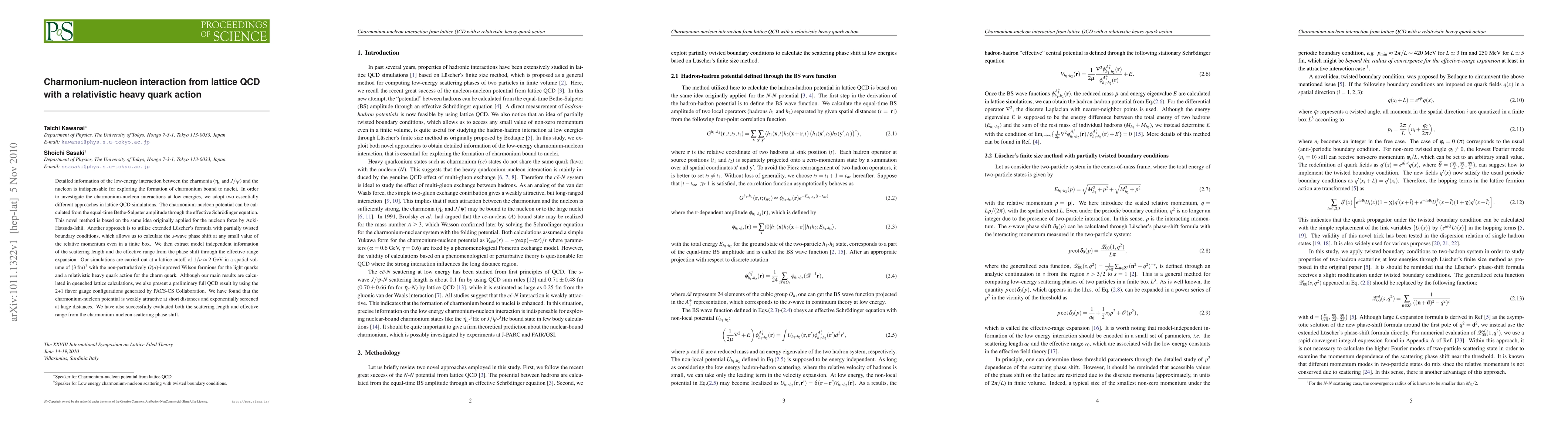 Detailed information of the low-energy interaction between the charmonia ({\eta}c and J/{\psi}) and the nucleon is indispensable for exploring the formation of charmonium bound to nuclei. In order to investigate the charmonium-nucleon interactions at low energies, we adopt two essentially different approaches in lattice QCD simulations. The charmonium-nucleon potential can be calculated from the equal-time Bethe-Salpeter amplitude through the effective Schr\"odinger equation. This novel method is based on the same idea originally applied for the nucleon force by Aoki- Hatsuda-Ishii. Another approach is to utilize extended L\"uscher's formula with partially twisted boundary conditions, which allows us to calculate the s-wave phase shift at any small value of the relative momentum even in a finite box. We then extract model independent information of the scattering length and the effective range from the phase shift through the effective-range expansion. Our simulations are carried out at a lattice cutoff of $1/a \approx$ 2 GeV in a spatial volume of (3 fm)^3 with the non-perturbatively O(a)-improved Wilson fermions for the light quarks and a relativistic heavy quark action for the charm quark. Although our main results are calculated in quenched lattice calculations, we also present a preliminary full QCD result by using the 2+1 flavor gauge configurations generated by PACS-CS Collaboration. We have found that the charmonium-nucleon potential is weakly attractive at short distances and exponentially screened at large distances. We have also successfully evaluated both the scattering length and effective range from the charmonium-nucleon scattering phase shift.