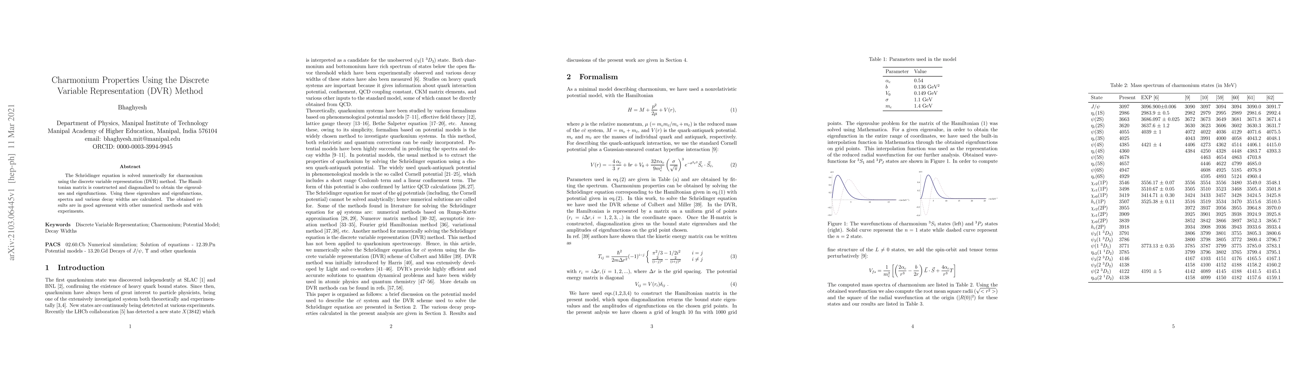 Researchers used a numerical method called DVR to solve the Schr"odinger equation for charmonium, obtaining results that agree with other methods and experiments, including calculated spectra and decay widths.