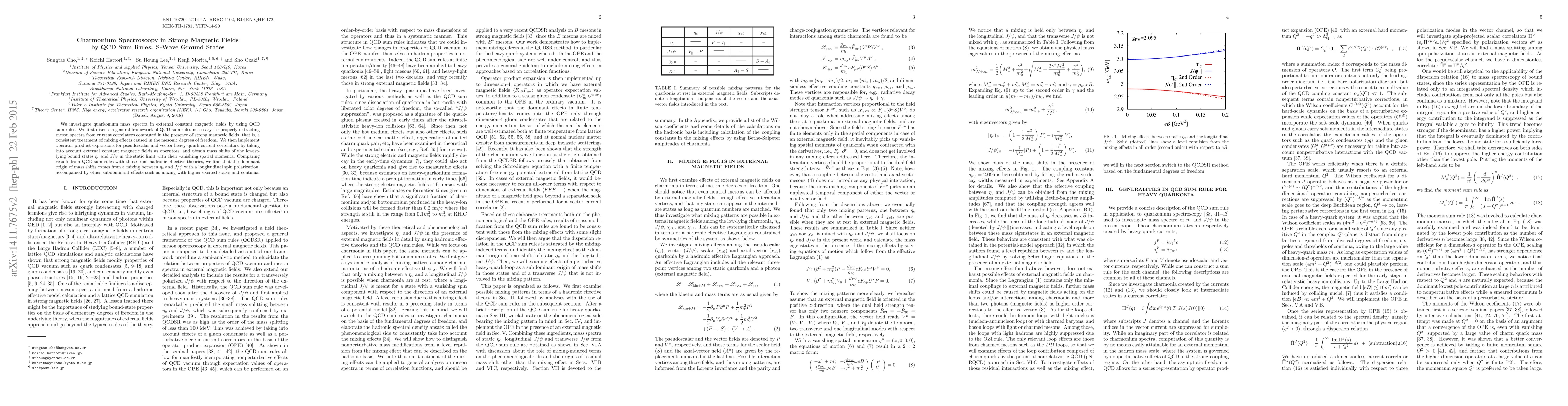 This paper uses QCD sum rules to study the mass spectra of charmonium in strong magnetic fields, focusing on the mixing effects and mass shifts of the $\eta_c$ and $J/\psi$ mesons. The results show that the primary mass shift is due to the mixing between $\eta_c$ and $J/\psi$ with longitudinal spin polarization, with additional contributions from higher states and continua.