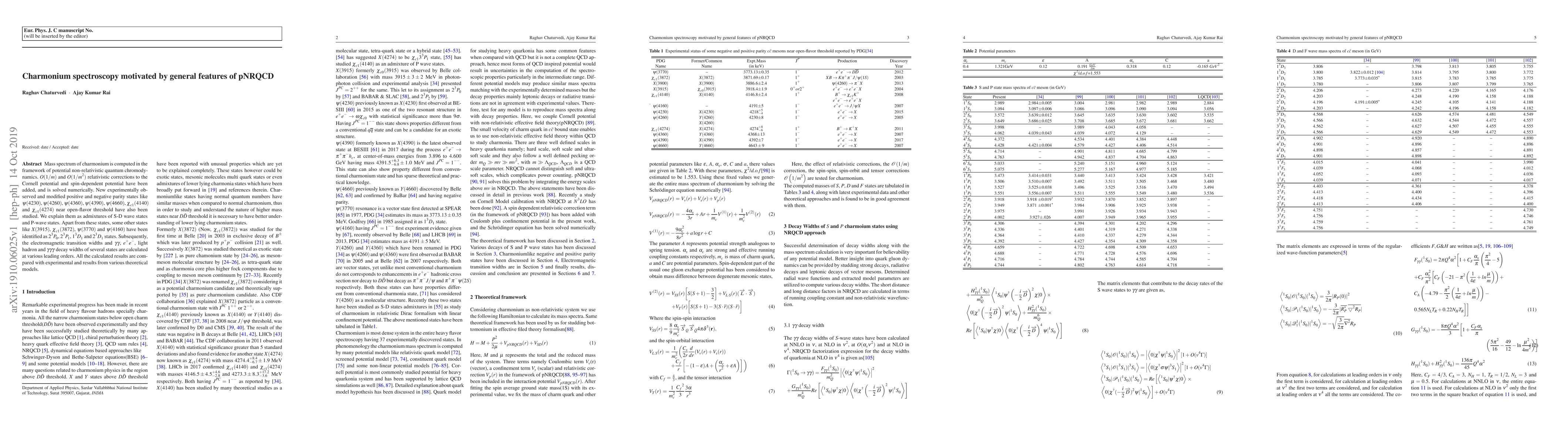 Mass spectrum of charmonium is computed in the framework of potential non-relativistic quantum chromodynamics. \textit{O}$(1/m)$ and \textit{O}$(1/m^2)$ relativistic corrections to the Cornell potential and spin-dependent potential have been added, and is solved numerically. New experimentally observed and modified positive and negative parity states like ${{\boldsymbol \psi}{(4230)}}$, ${{\boldsymbol \psi}{(4260)}}$, ${{\boldsymbol \psi}{(4360)}}$, ${{\boldsymbol \psi}{(4390)}}$, ${{\boldsymbol \psi}{(4660)}}$, ${{\boldsymbol \chi}_{{c1}}{(4140)}}$ and ${{\boldsymbol \chi}_{{c1}}{(4274)}}$ near open-flavor threshold have also been studied. We explain them as admixtures of S-D wave states and P-wave states. Apart from these states, some other states like ${{\mathit X}{(3915)}}$, ${{\boldsymbol \chi}_{{c1}}{(3872)}}$, ${{\boldsymbol \psi}{(3770)}}$ and ${{\boldsymbol \psi}{(4160)}}$ have been identified as $2^3P_0$, $2^3P_1$, $1^3D_1$ and $2^3D_1$ states. Subsequently, the electromagnetic transition widths and $\gamma\gamma$, $e^+e^-$, light hadron and $\gamma\gamma\gamma$ decay widths of several states are calculated at various leading orders. All the calculated results are compared with experimental and results from various theoretical models.