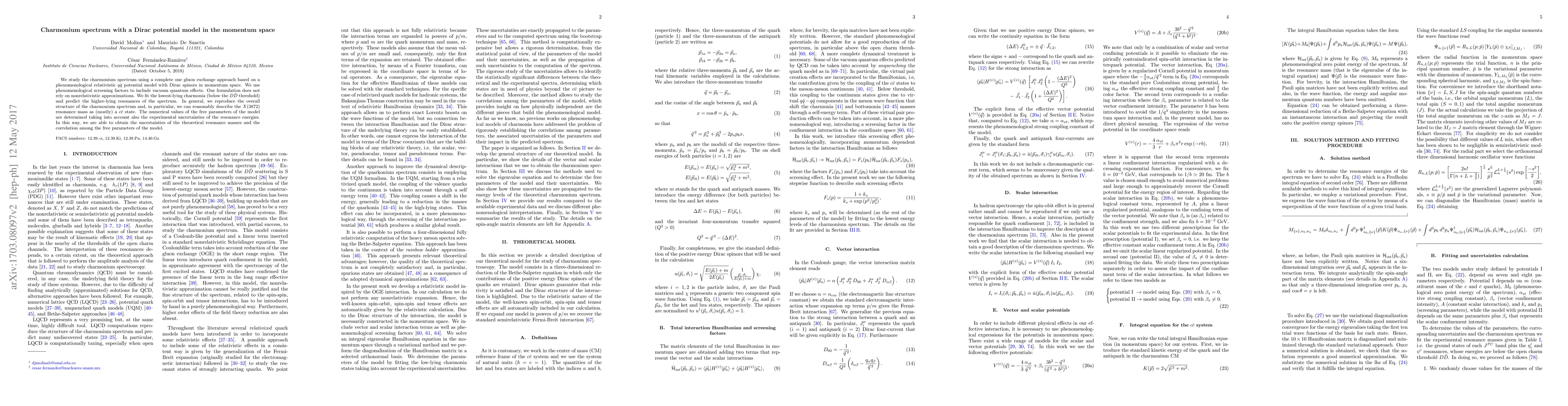 We study the charmonium spectrum using a complete one gluon exchange approach based on a phenomenological relativistic $q\bar{q}$ potential model with Dirac spinors in momentum space. We use phenomenological screening factors to include vacuum quantum effects. Our formulation does not rely on nonrelativistic approximations. We fit the lowest-lying charmonia (below the $D\bar{D}$ threshold) and predict the higher-lying resonances of the spectrum. In general, we reproduce the overall structure of the charmonium spectrum and, in particular, we can reasonably describe the $X(3872)$ resonance mass as (mostly) a $c\bar{c}$ state. The numerical values of the free parameters of the model are determined taking into account also the experimental uncertainties of the resonance energies. In this way, we are able to obtain the uncertainties of the theoretical resonance masses and the correlation among the free parameters of the model.