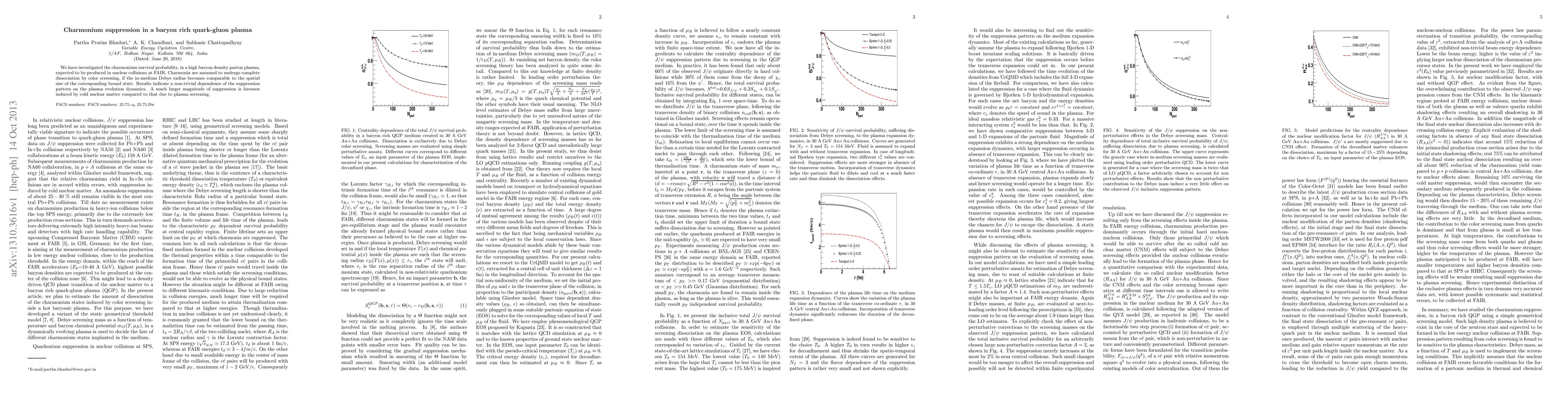 The paper presents a geometrical screening model to study charmonium suppression in a baryon-rich QGP, incorporating both cold nuclear matter and plasma screening effects.