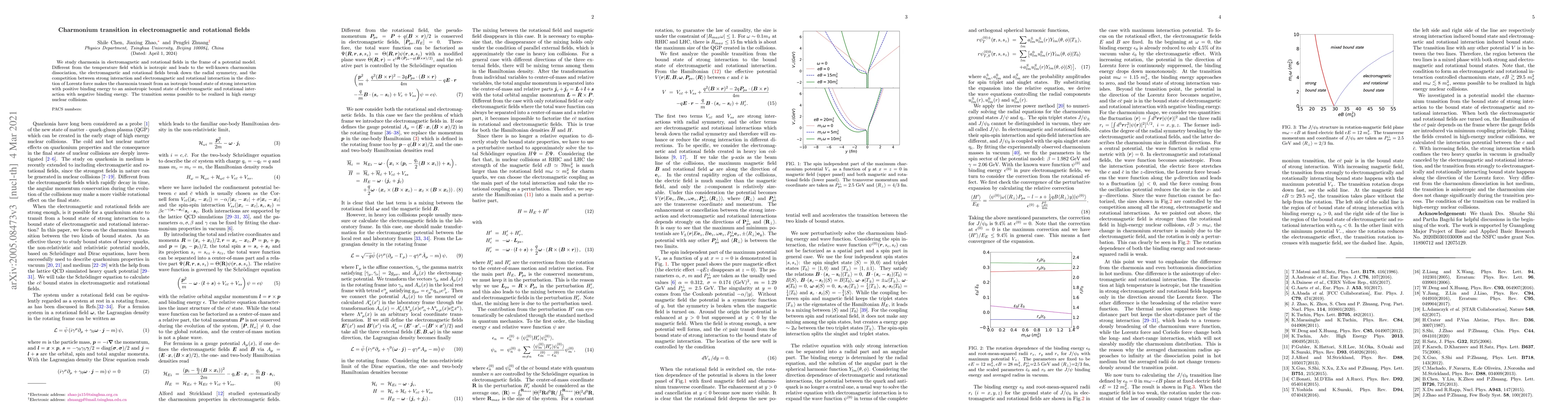 This study explores charmonia behavior under electromagnetic and rotational fields using a potential model, revealing a transition from isotropic strong interaction bound states to anisotropic states influenced by Lorentz force, suggesting this transition could occur in high-energy nuclear collisions.