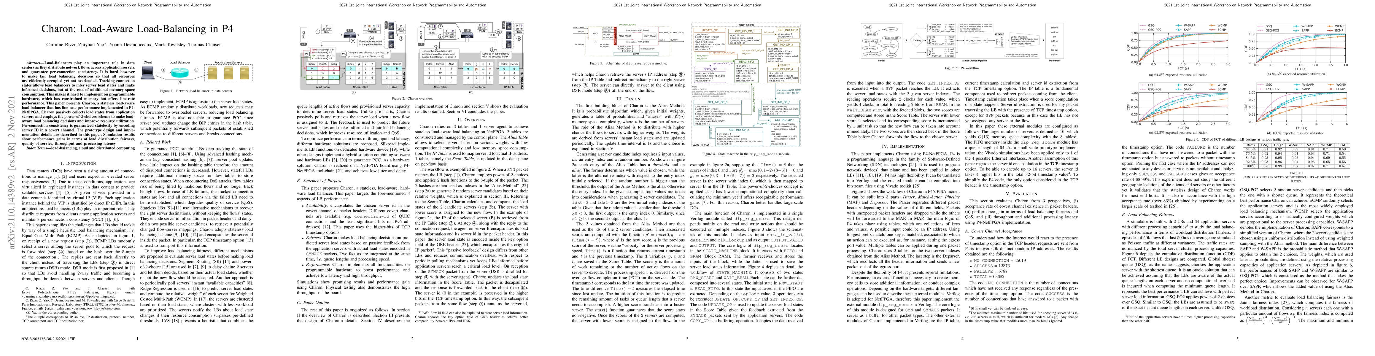 Charon is a stateless load-aware load balancer implemented in P4-NetFPGA that achieves line-rate performance by passively collecting load states from application servers and employing the power-of-2-choices scheme for data-driven load balancing, while preserving per-connection consistency statelessly. Simulation results demonstrate improved load distribution fairness, quality of service, throughput, and reduced processing latency.