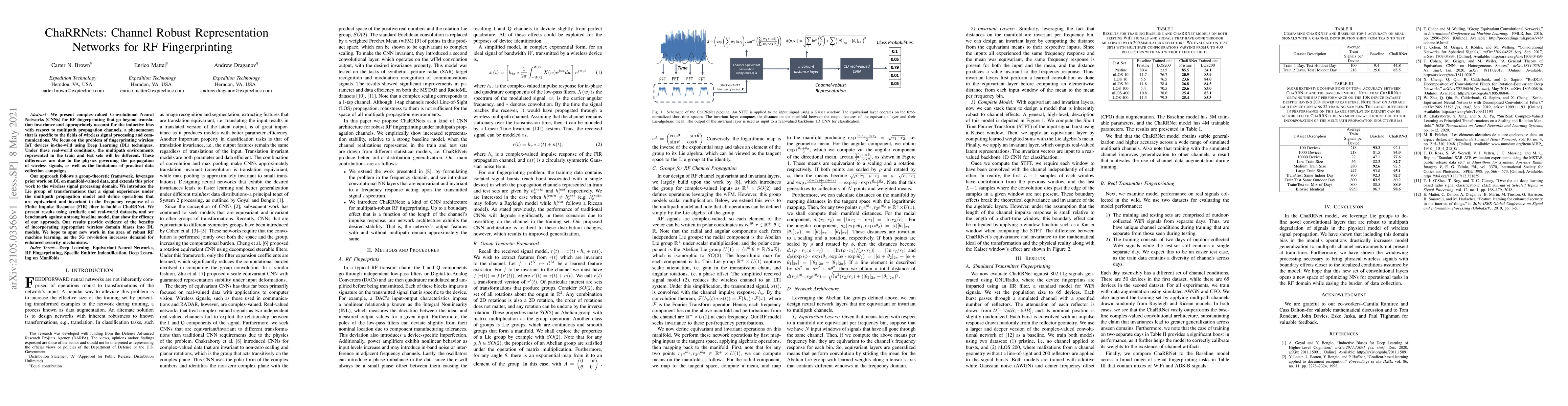 We present complex-valued Convolutional Neural Networks (CNNs) for RF fingerprinting that go beyond translation invariance and appropriately account for the inductive bias with respect to multipath propagation channels, a phenomenon that is specific to the fields of wireless signal processing and communications. We focus on the problem of fingerprinting wireless IoT devices in-the-wild using Deep Learning (DL) techniques. Under these real-world conditions, the multipath environments represented in the train and test sets will be different. These differences are due to the physics governing the propagation of wireless signals, as well as the limitations of practical data collection campaigns. Our approach follows a group-theoretic framework, leverages prior work on DL on manifold-valued data, and extends this prior work to the wireless signal processing domain. We introduce the Lie group of transformations that a signal experiences under the multipath propagation model and define operations that are equivariant and invariant to the frequency response of a Finite Impulse Response (FIR) filter to build a ChaRRNet. We present results using synthetic and real-world datasets, and we benchmark against a strong baseline model, that show the efficacy of our approach. Our results provide evidence of the benefits of incorporating appropriate wireless domain biases into DL models. We hope to spur new work in the area of robust RF machine learning, as the 5G revolution increases demand for enhanced security mechanisms.
