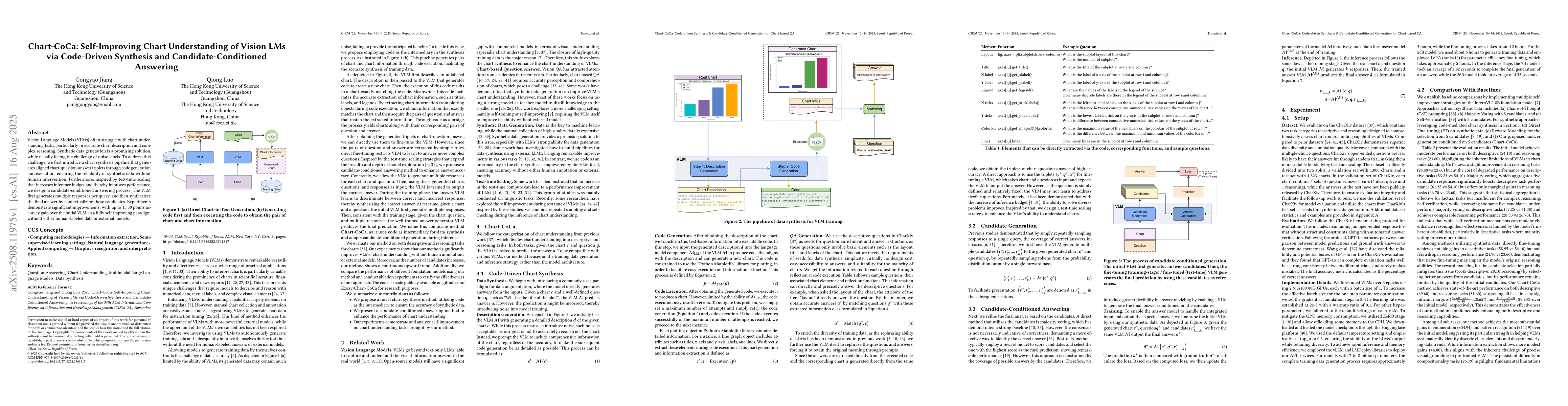 Vision Language Models (VLMs) often struggle with chart understanding tasks, particularly in accurate chart description and complex reasoning. Synthetic data generation is a promising solution, while usually facing the challenge of noise labels. To address this challenge, we first introduce a chart synthesis pipeline that generates aligned chart-question-answer triplets through code generation and execution, ensuring the reliability of synthetic data without human intervention. Furthermore, inspired by test-time scaling that increases inference budget and thereby improves performance, we design a candidate-conditioned answering process. The VLM first generates multiple responses per query, and then synthesizes the final answer by contextualizing these candidates. Experiments demonstrate significant improvements, with up to 15.50 points accuracy gain over the initial VLM, in a fully self-improving paradigm without either human-labeled data or external models.