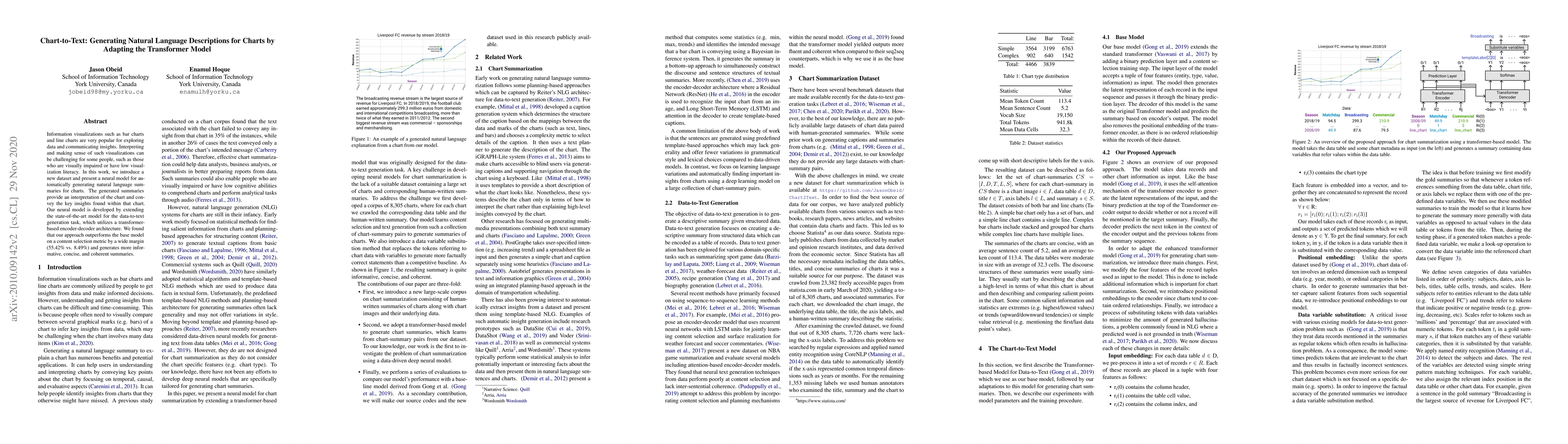 Information visualizations such as bar charts and line charts are very popular for exploring data and communicating insights. Interpreting and making sense of such visualizations can be challenging for some people, such as those who are visually impaired or have low visualization literacy. In this work, we introduce a new dataset and present a neural model for automatically generating natural language summaries for charts. The generated summaries provide an interpretation of the chart and convey the key insights found within that chart. Our neural model is developed by extending the state-of-the-art model for the data-to-text generation task, which utilizes a transformer-based encoder-decoder architecture. We found that our approach outperforms the base model on a content selection metric by a wide margin (55.42% vs. 8.49%) and generates more informative, concise, and coherent summaries.